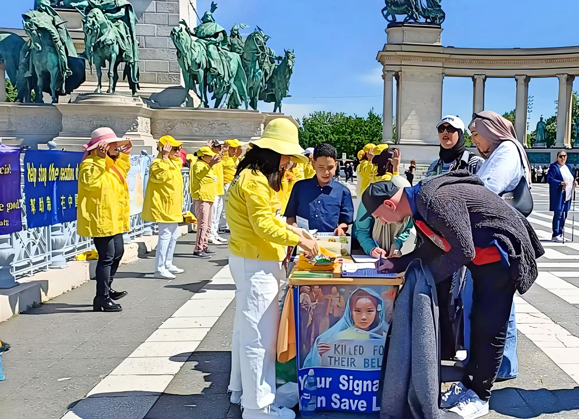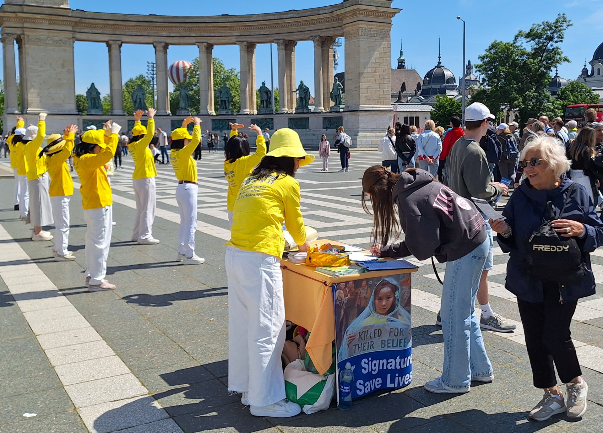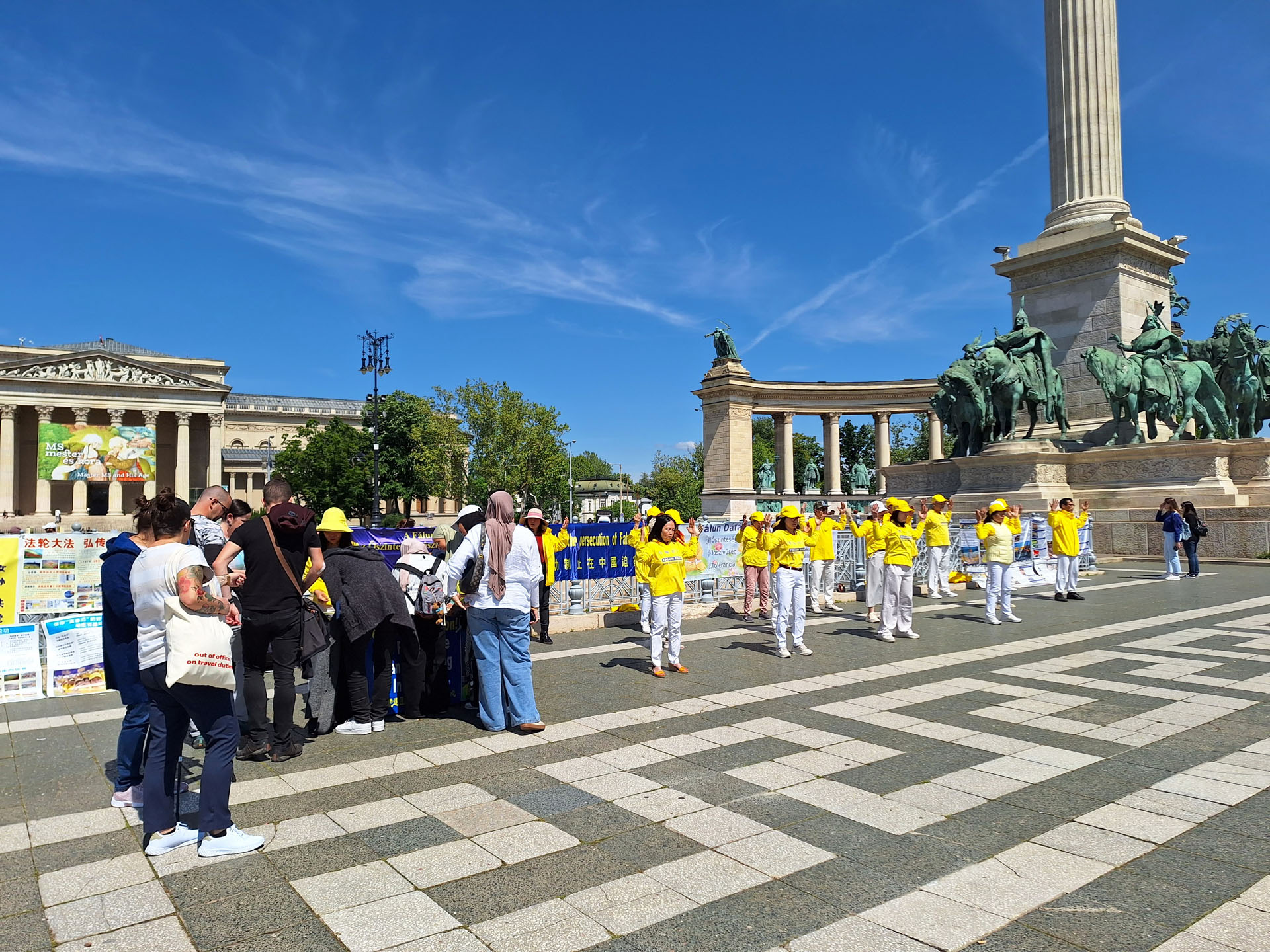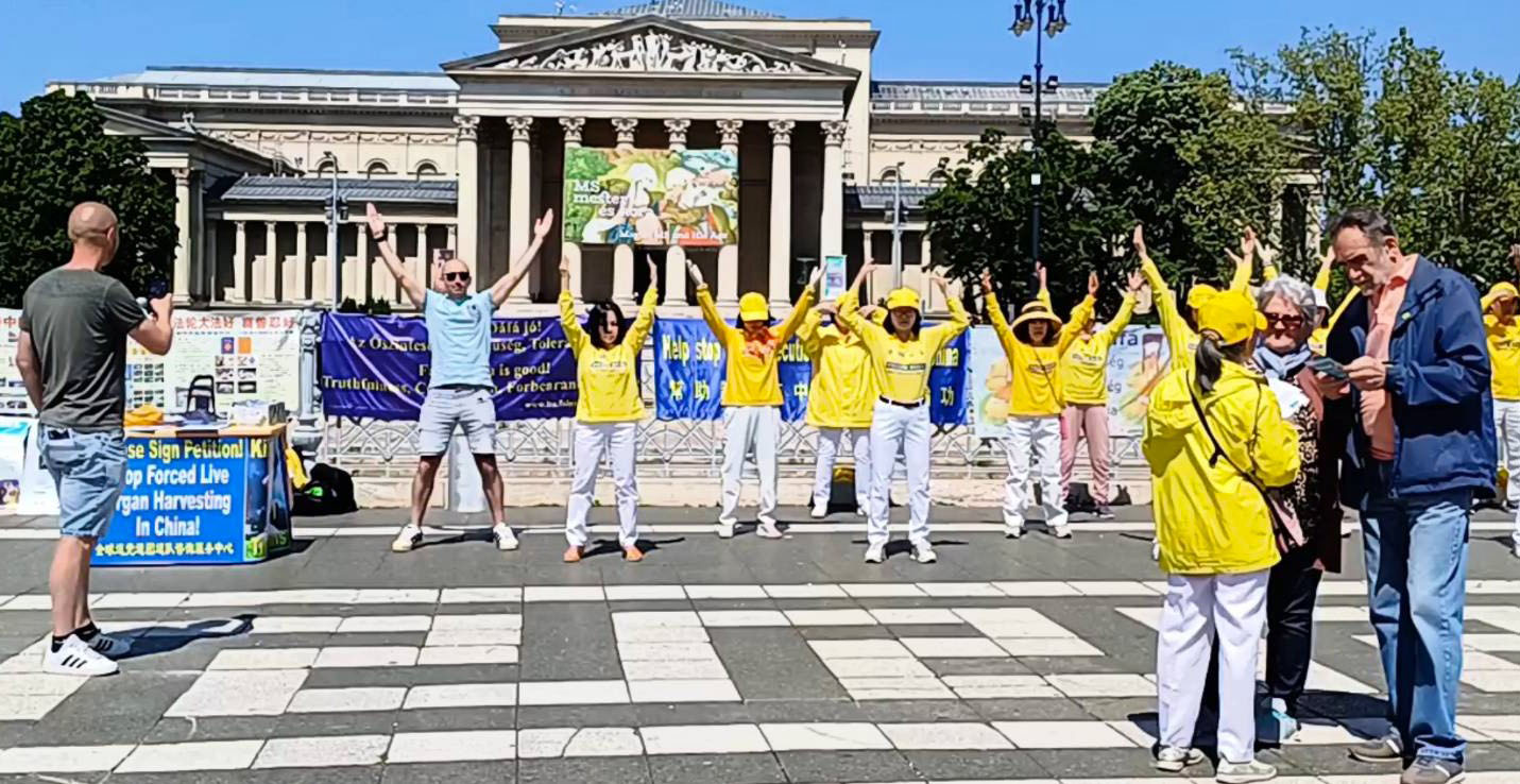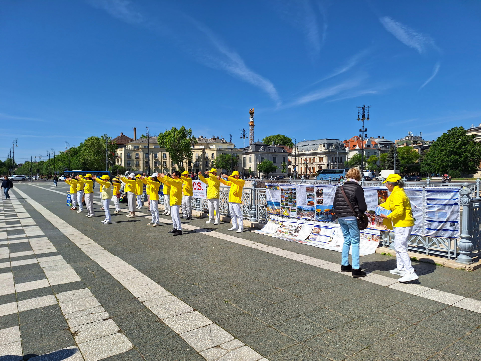 ![]() 圖1~2:二零二五年五月十日,法輪功學員在布達佩斯舉行活動,慶祝世界法輪大法日。圖為學員們正在展示功法。 |