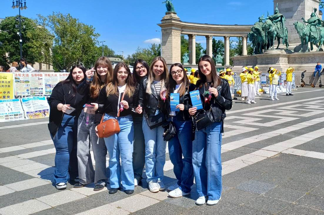 一群來自荷蘭的女學生來到展台前,向學員了解法輪大法。其中一人表示,她們被煉功學員所展現出的平和與放鬆的氛圍所打動。她們拿了一些傳單,希望回國後與朋友們分享。隨後,她們請一位學員為她們在活動現場拍照,以便分享到社交媒體上,讓更多人了解法輪功學員的故事。