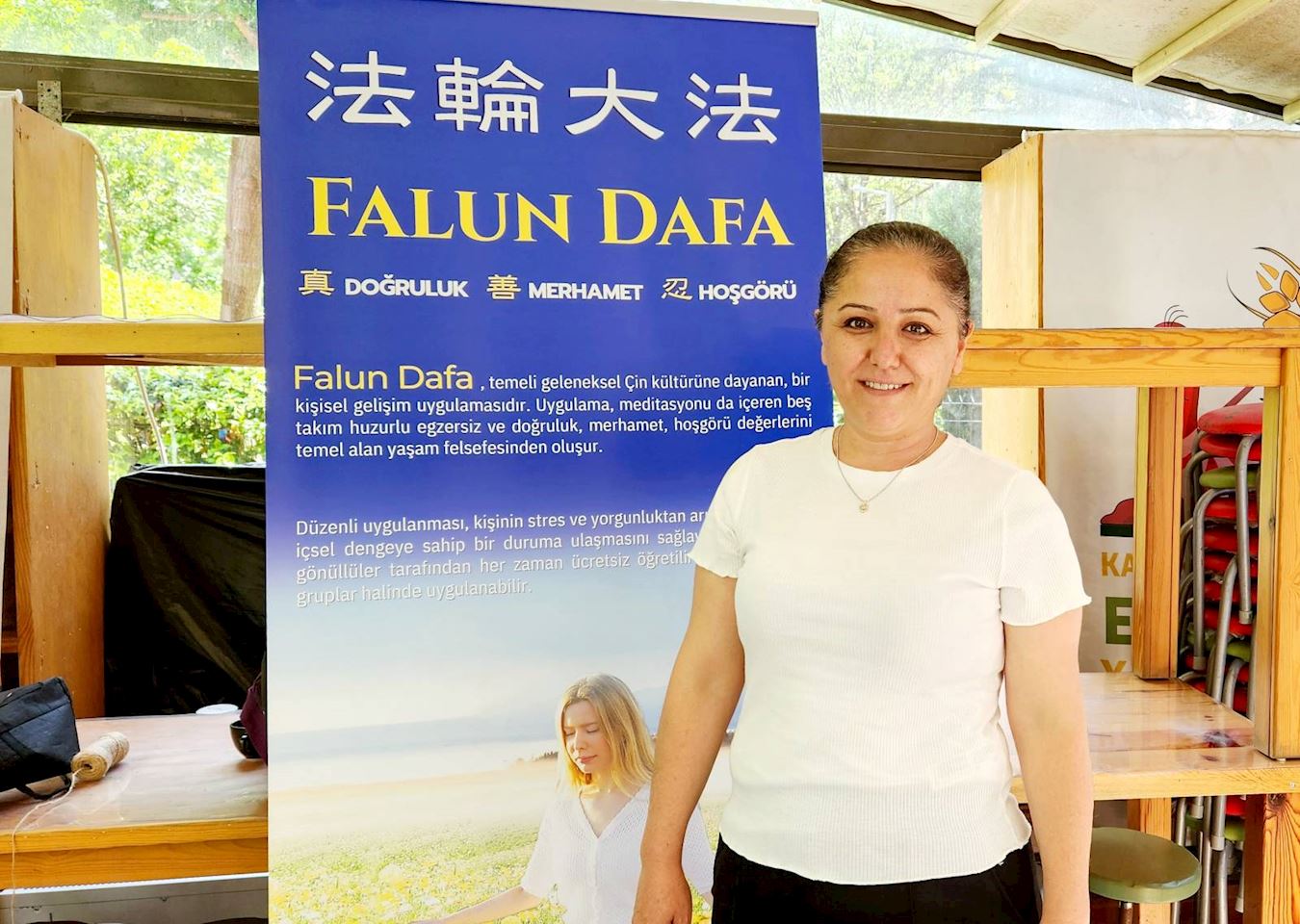 語言治療師布瑟﹒居內欣(Buse Güneşsin)說:「我剛剛接觸法輪大法。在我們一起煉功的這一小時裏,我非常驚訝地發現,昨晚開始背部的疼痛有了明顯好轉,讓我印象深刻。」