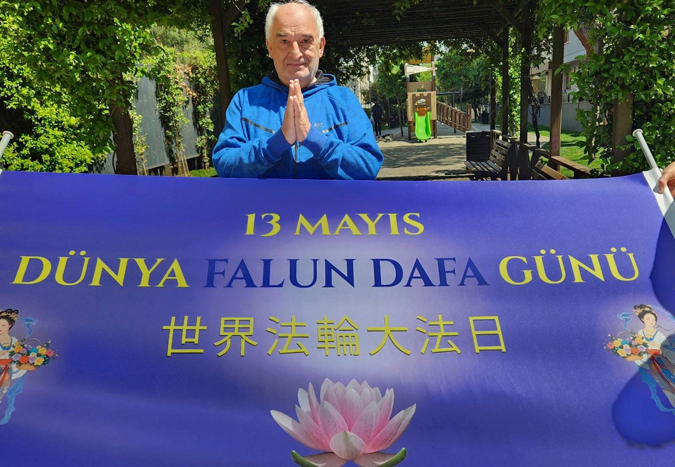費爾薩特﹒耶爾馬茲(Ferşat Yılmaz)說:「感謝法輪大法李洪志師父,帶來這麼美好的功法。祝您生日快樂!」