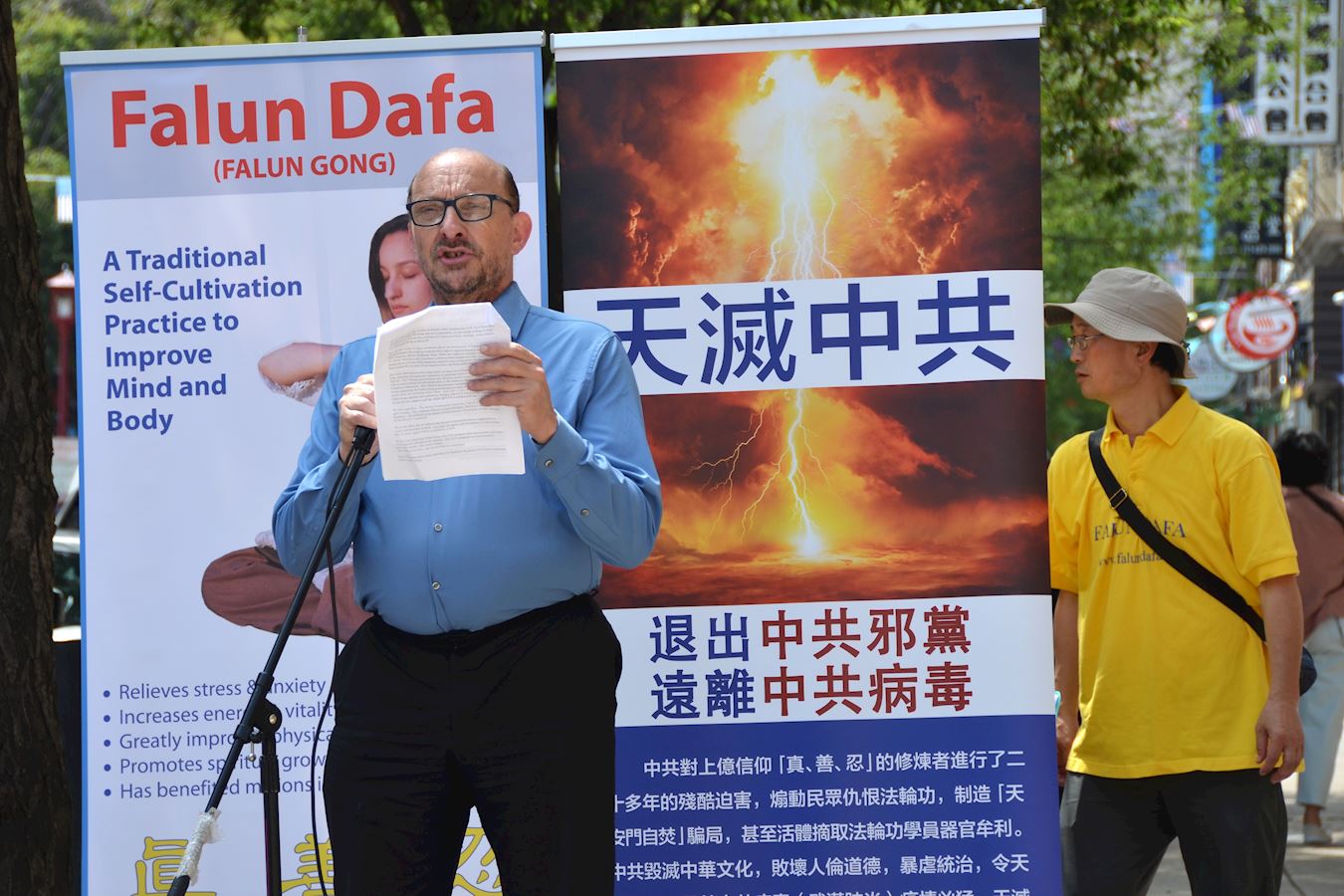 ![]() 圖5:二零二五年六月二十八日,大費城地區部份法輪功學員在費城唐人街集會,呼籲國際社會制止中共長達二十六年的非法迫害。圖為拉薩爾大學(La Salle University)政治學系主任馬克﹒托馬斯博士在集會上講話,譴責中共對法輪功的跨國迫害。 |