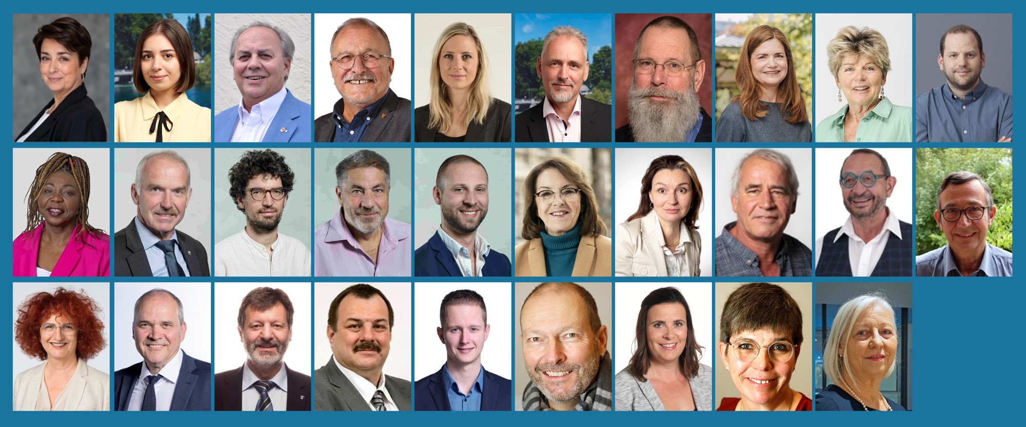 第三排:納沙泰爾州大議會議員布裏吉特‧萊滕貝格(Brigitte Leitenberg)弗裏堡州大議會議員:休伯特﹒達夫隆(Hubert Dafflon);弗裏茨‧格勞澤(Fritz Glauser);伯特蘭﹒蓋拉德(Bertrand Gaillard);瓦萊州大議會議員馬克西姆‧莫伊克斯(Maxime Moix);汝拉州州議會議員:尼古拉斯‧吉拉德(Nicolas Girard);傑麗卡‧奧布裏-揚凱蒂奇(Jelica Aubry-Janketic);索菲‧蓋諾特(Sophie Guenot); 提契諾州大議會議員瑪麗亞‧皮亞‧安布羅塞蒂(Maria Pia Ambrosetti)