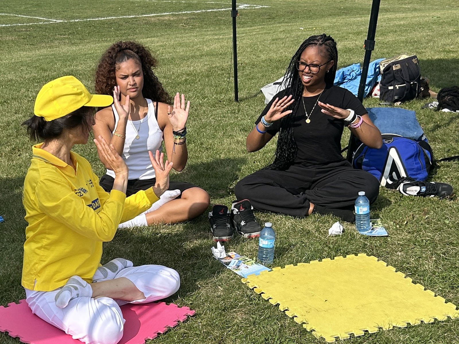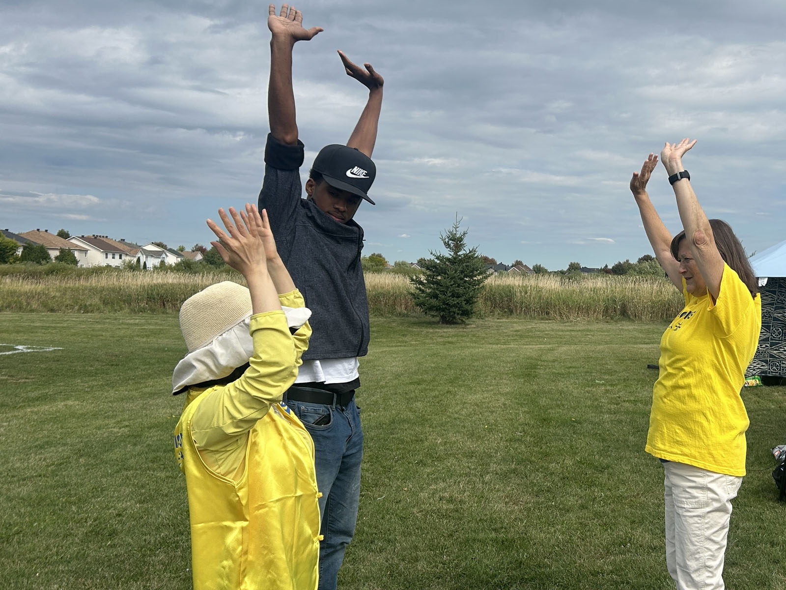 高中生塞巴斯蒂安(Jean Sebastien)現場學功後表示,學煉法輪功讓他感受到能量流動與身心放鬆。他說:「我喜歡這種能量和身體的振動。」
