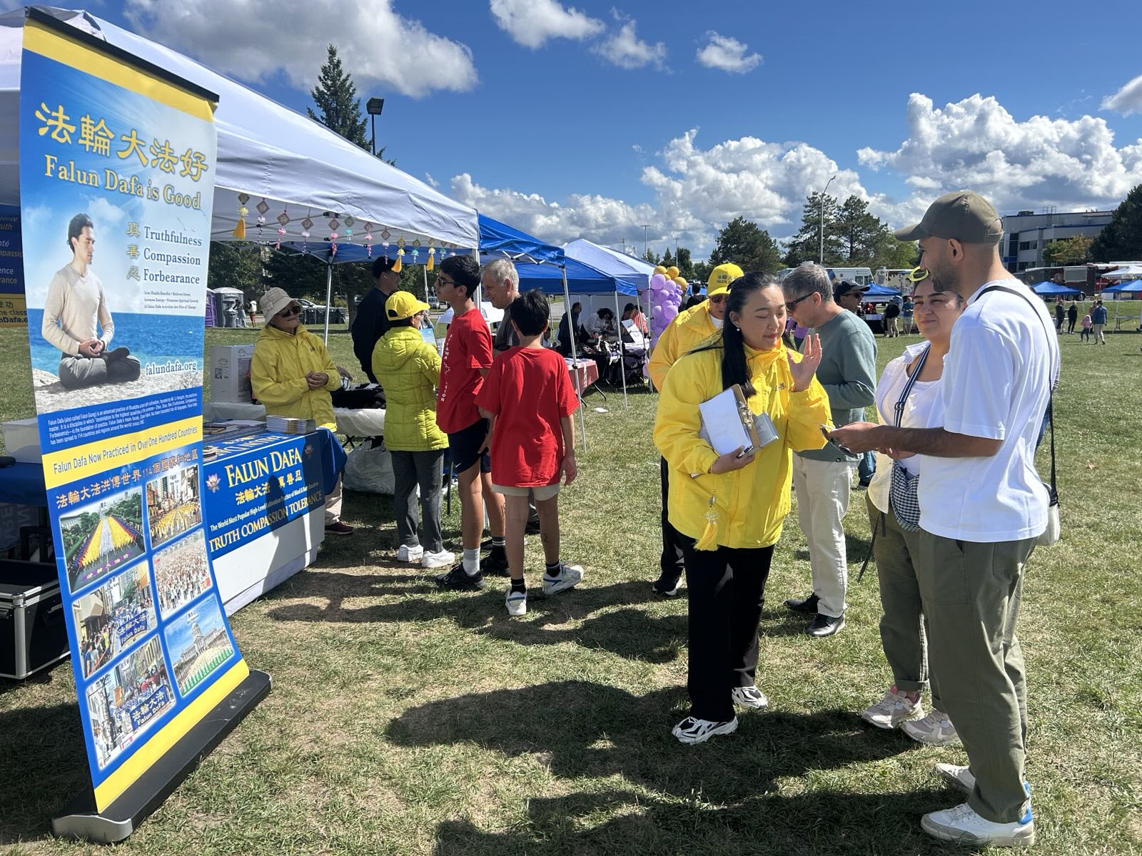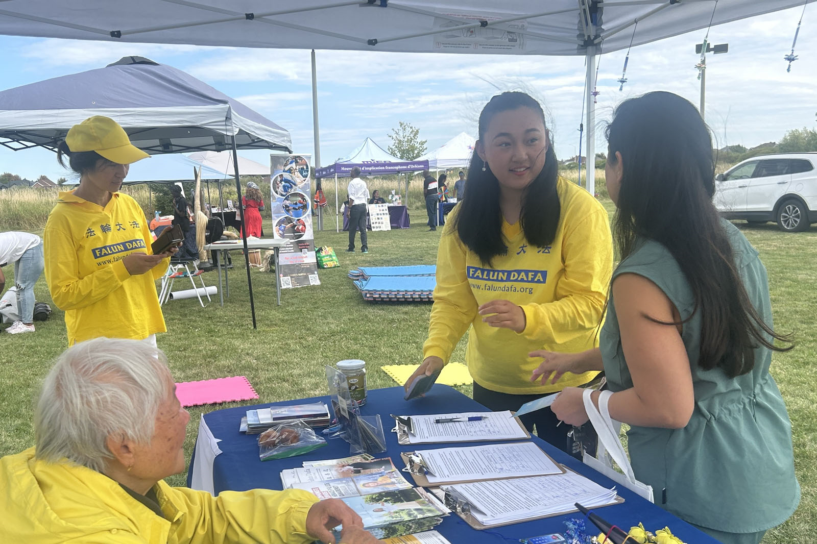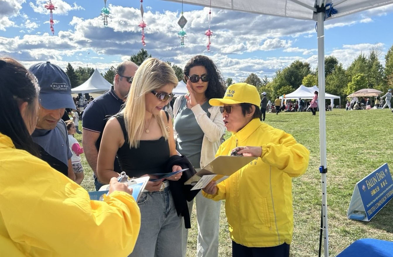 在法輪功展位前,民眾了解到中共對法輪功長達26年的迫害,及其跨國鎮壓行動,包括在加拿大多地對神韻演出進行恐嚇與威脅。許多民眾在請願信上簽名,呼籲國會立法制止中共的跨境打壓。