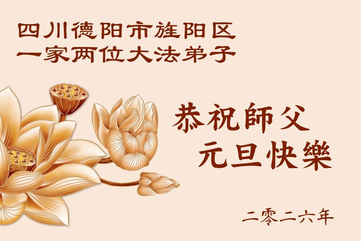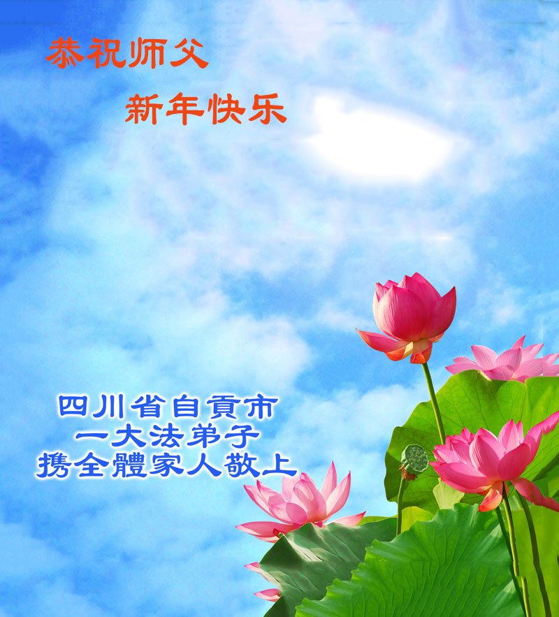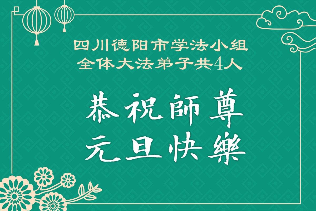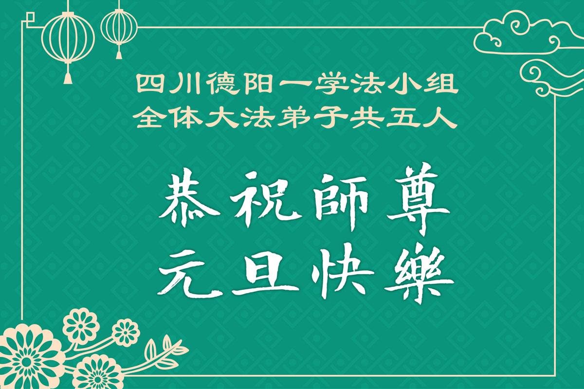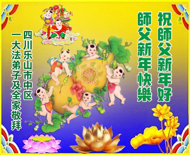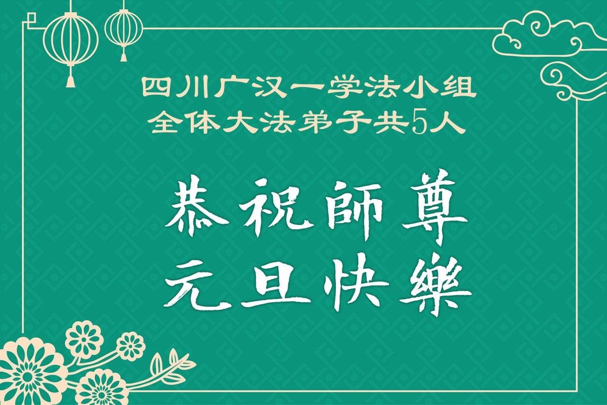 我們是四川省廣漢市一家庭大法弟子學法小組,我謹代表全家五名大法弟子及四名家人恭祝師父新年快樂!在新的一年裏,我們一定會學好法,向內找,同化大法,修好自己。不辜負師父的慈悲苦度,圓滿隨師還。