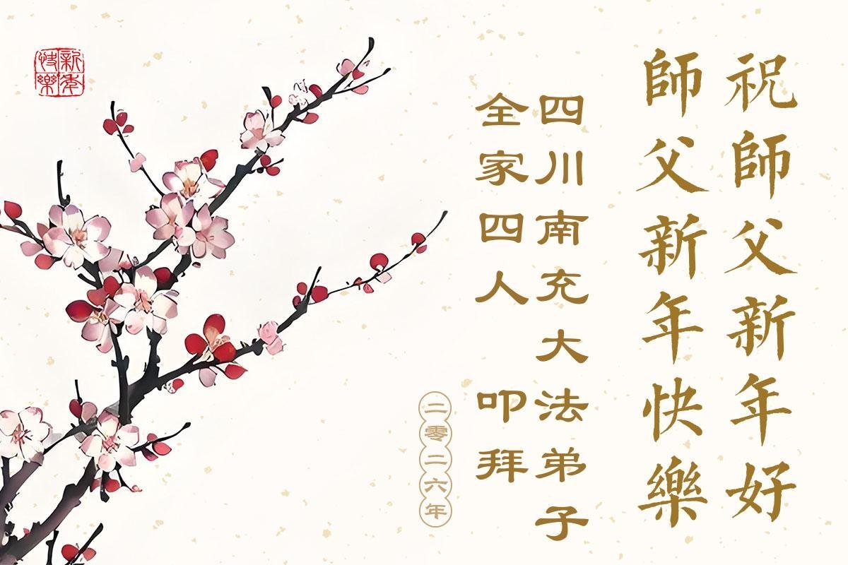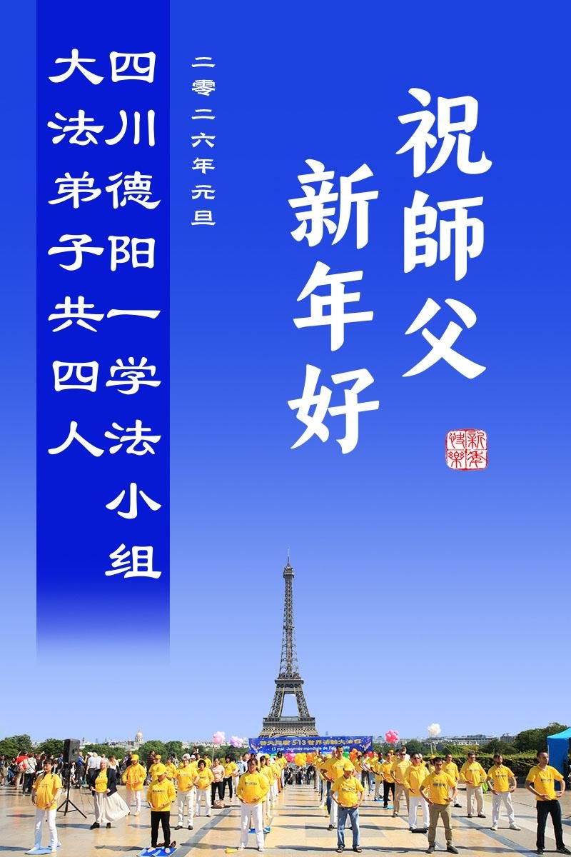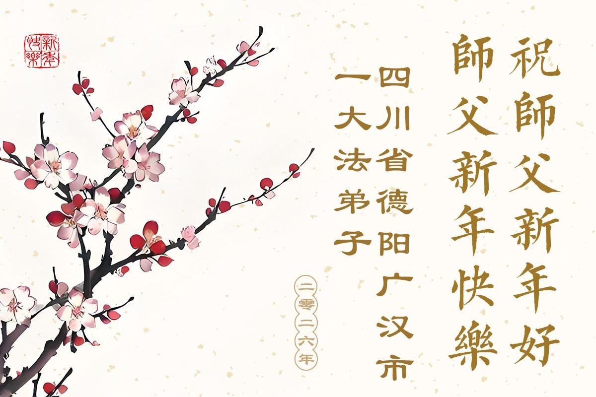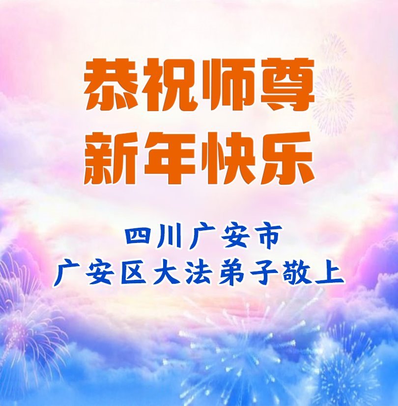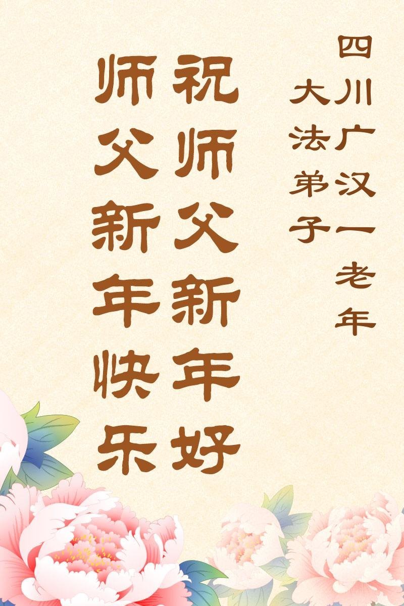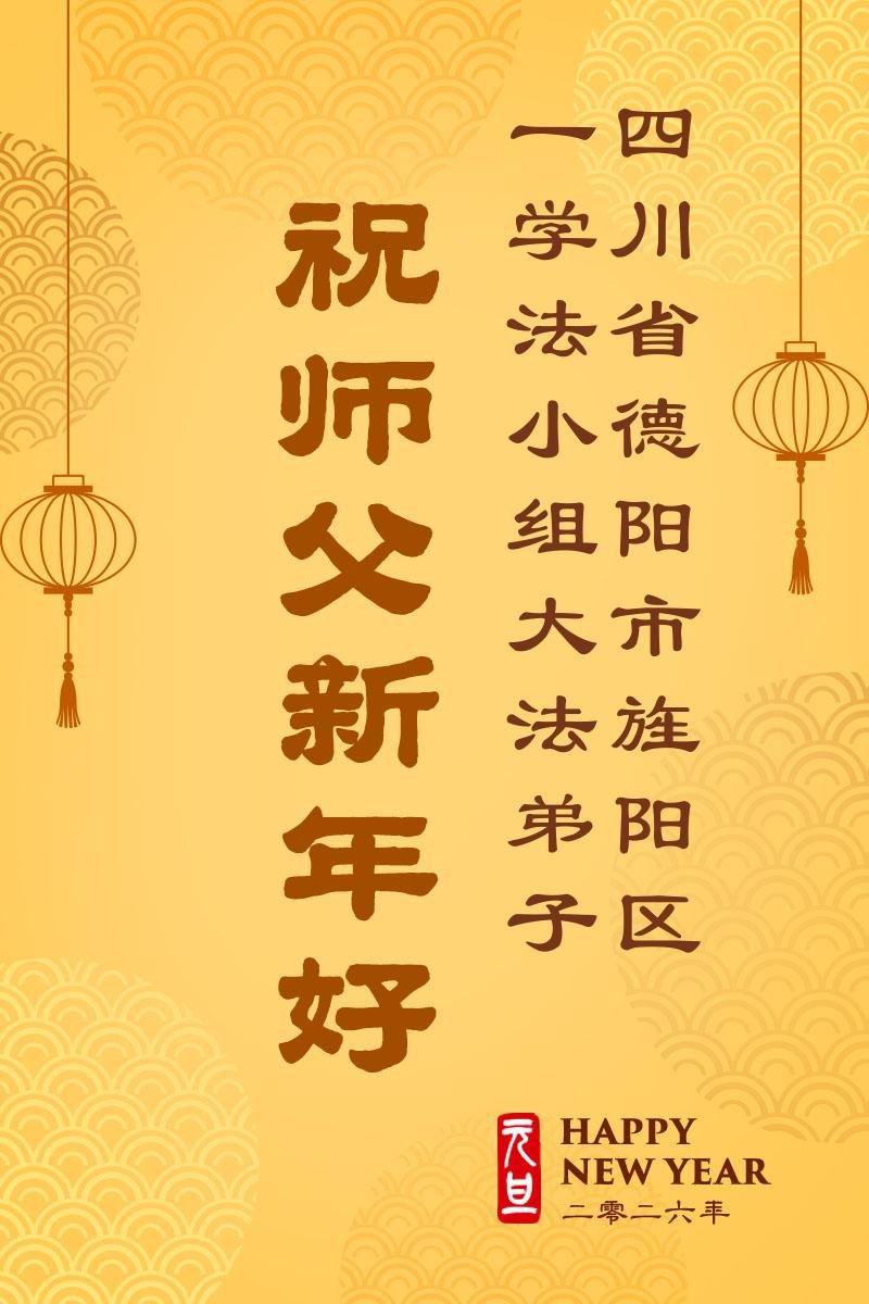 我們是四川省廣漢市一家庭大法弟子學法小組,我謹代表全家五名大法弟子及四名家人恭祝師父新年快樂!在新的一年裏,我們一定會學好法,向內找,同化大法,修好自己。不辜負師父的慈悲苦度,圓滿隨師還。