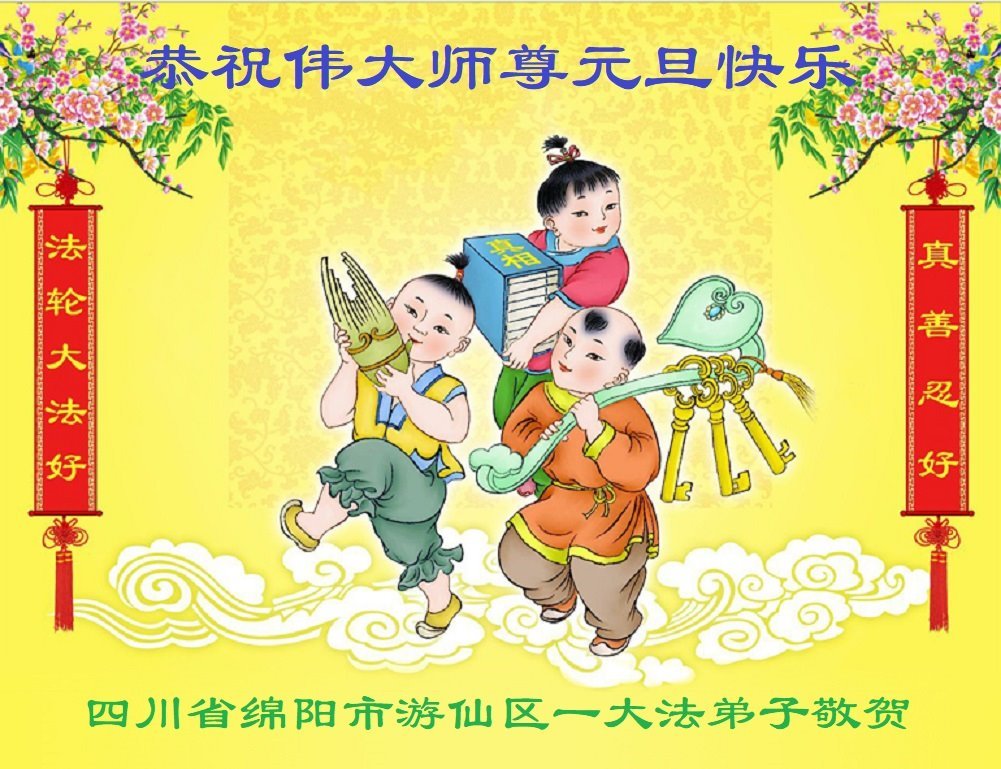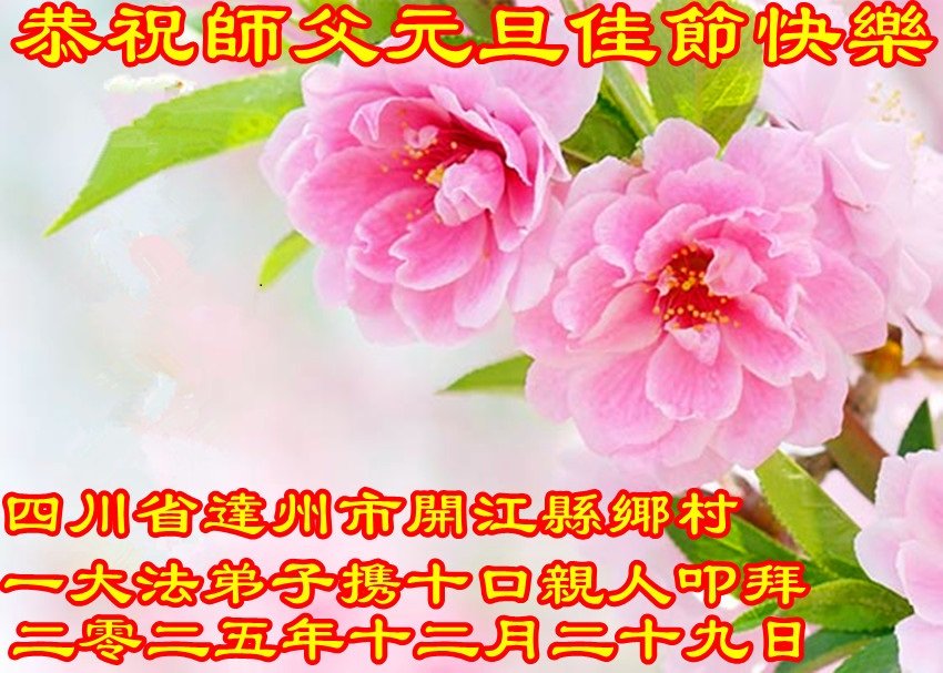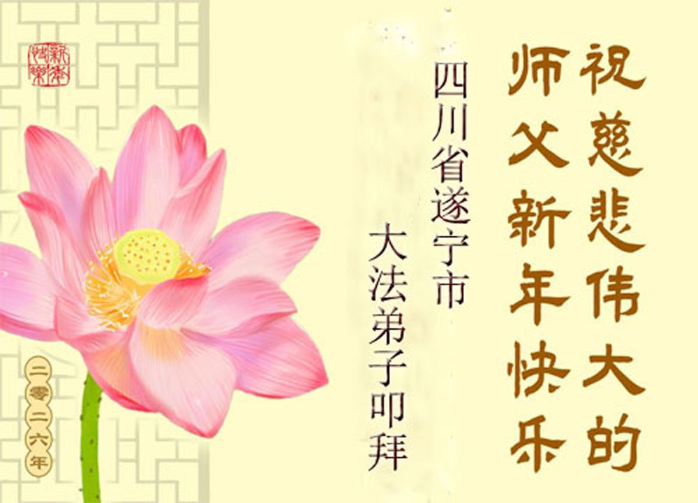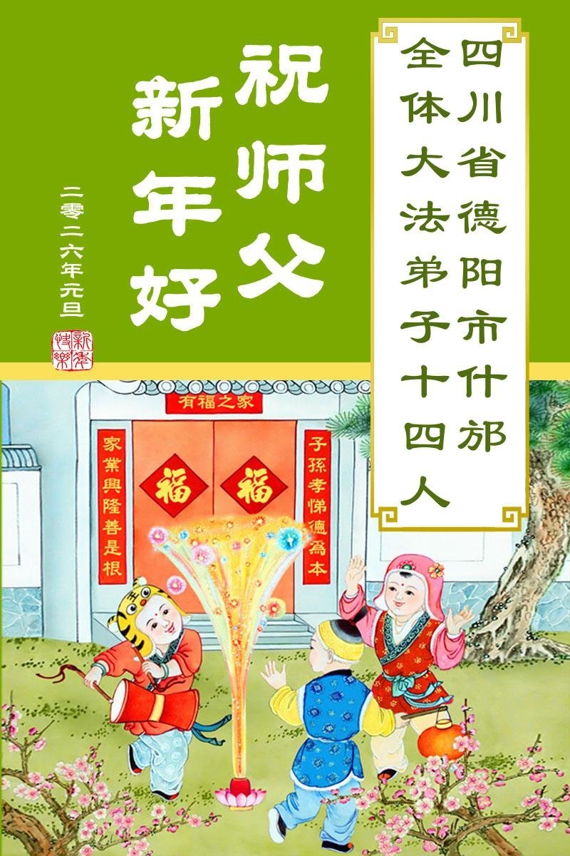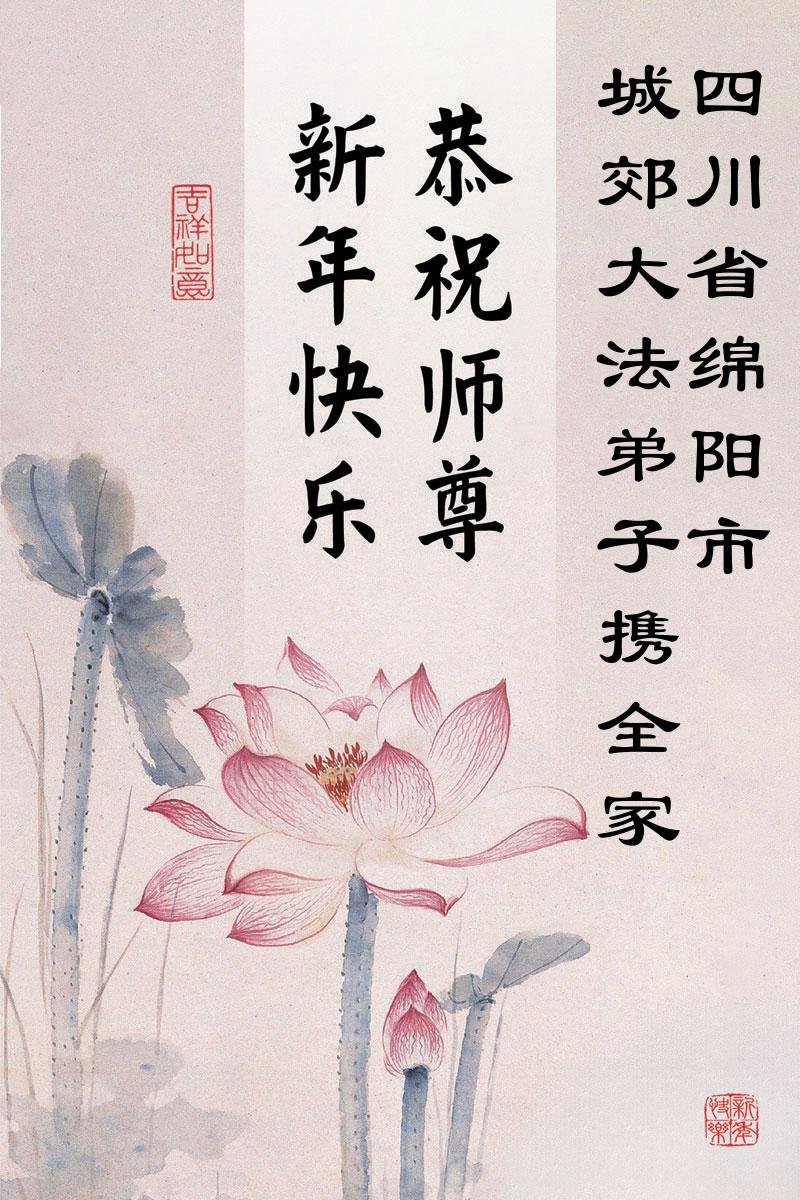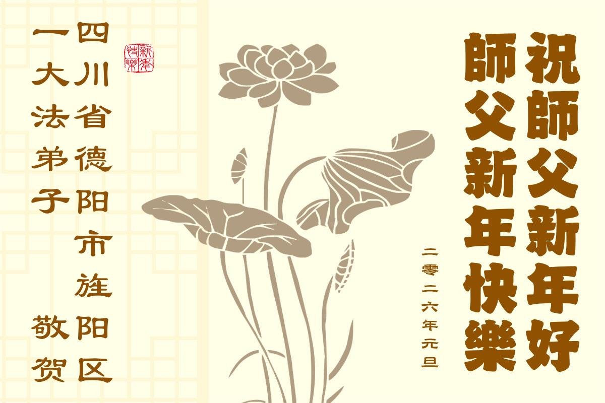 我們是四川省廣漢市一家庭大法弟子學法小組,我謹代表全家五名大法弟子及四名家人恭祝師父新年快樂!在新的一年裏,我們一定會學好法,向內找,同化大法,修好自己。不辜負師父的慈悲苦度,圓滿隨師還。