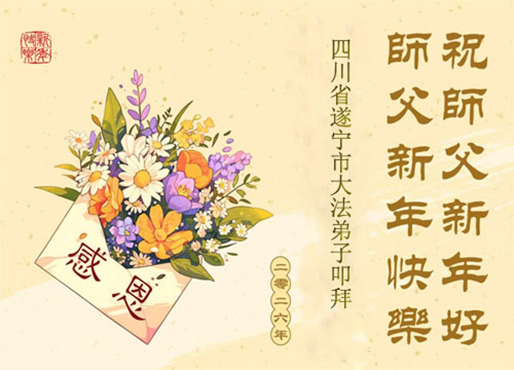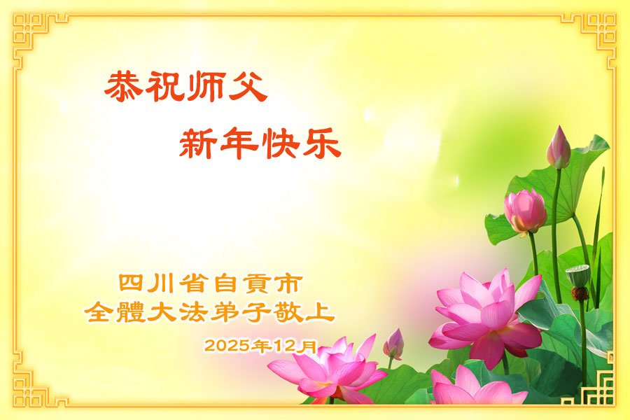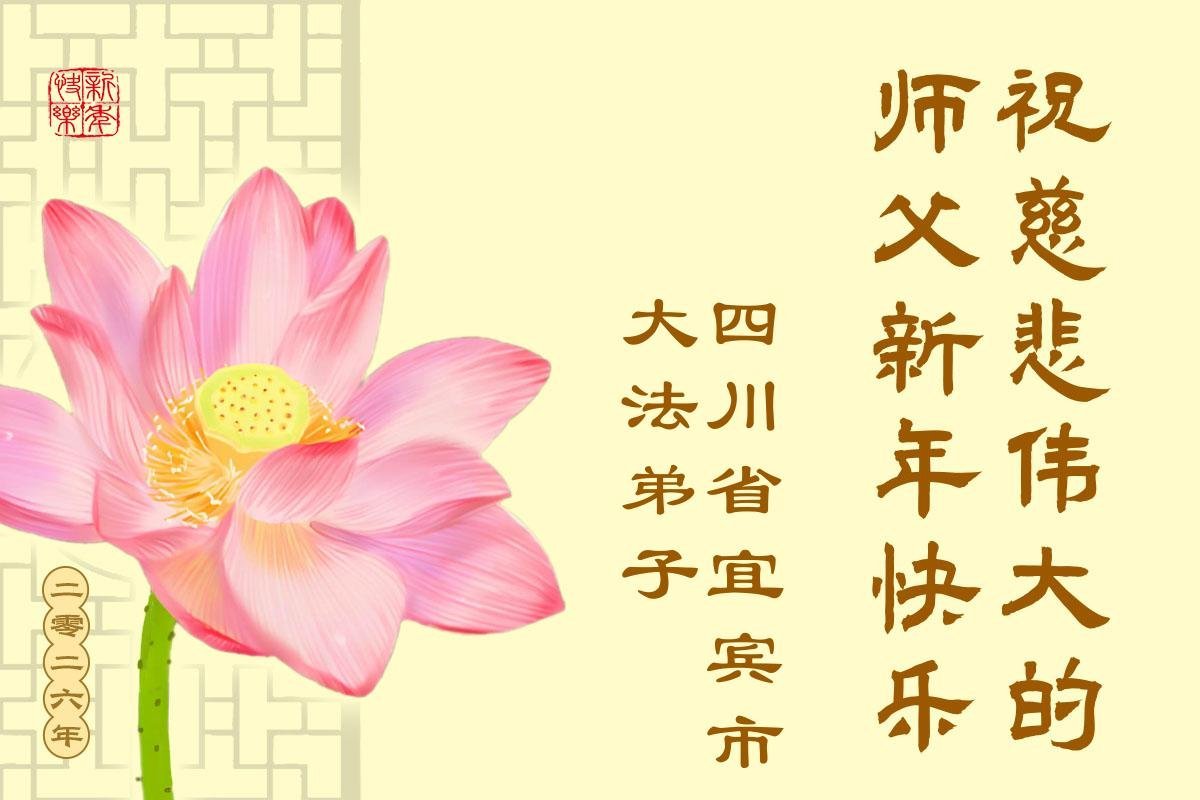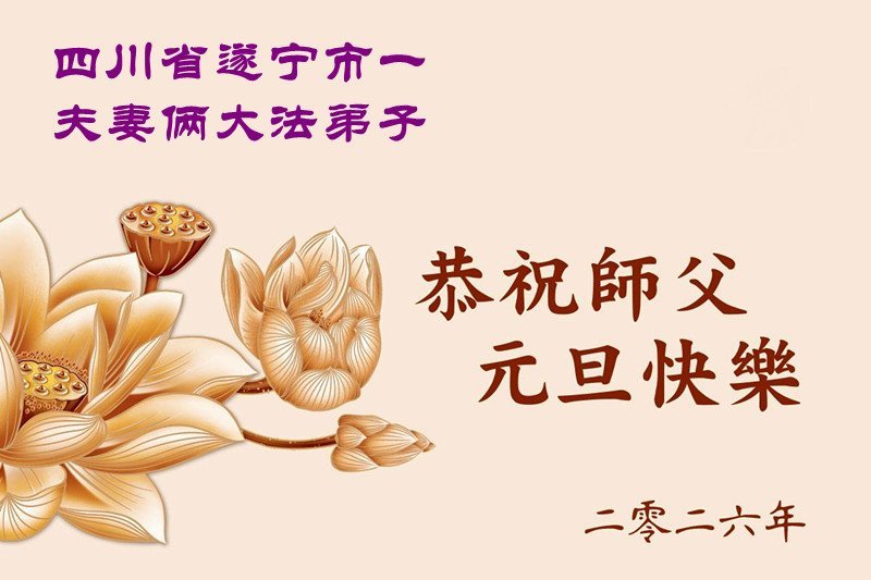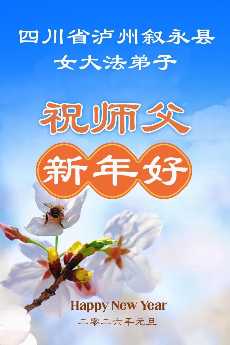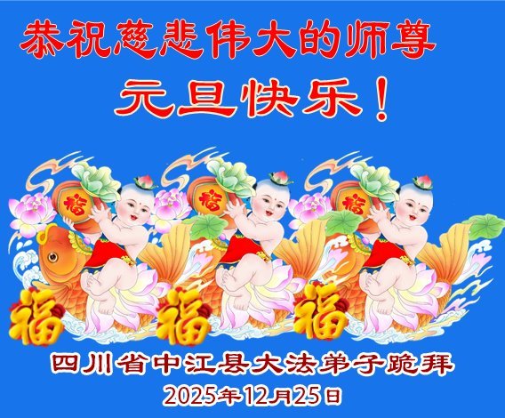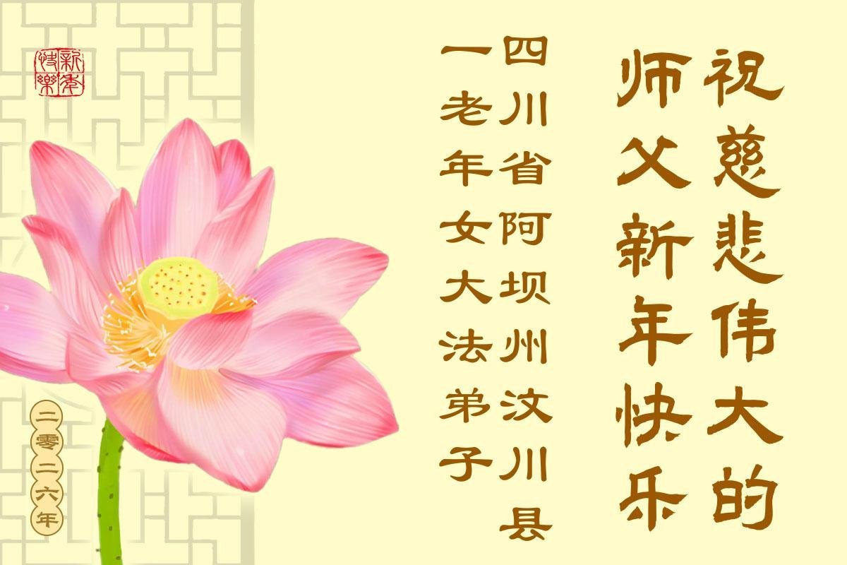 我們是四川省廣漢市一家庭大法弟子學法小組,我謹代表全家五名大法弟子及四名家人恭祝師父新年快樂!在新的一年裏,我們一定會學好法,向內找,同化大法,修好自己。不辜負師父的慈悲苦度,圓滿隨師還。