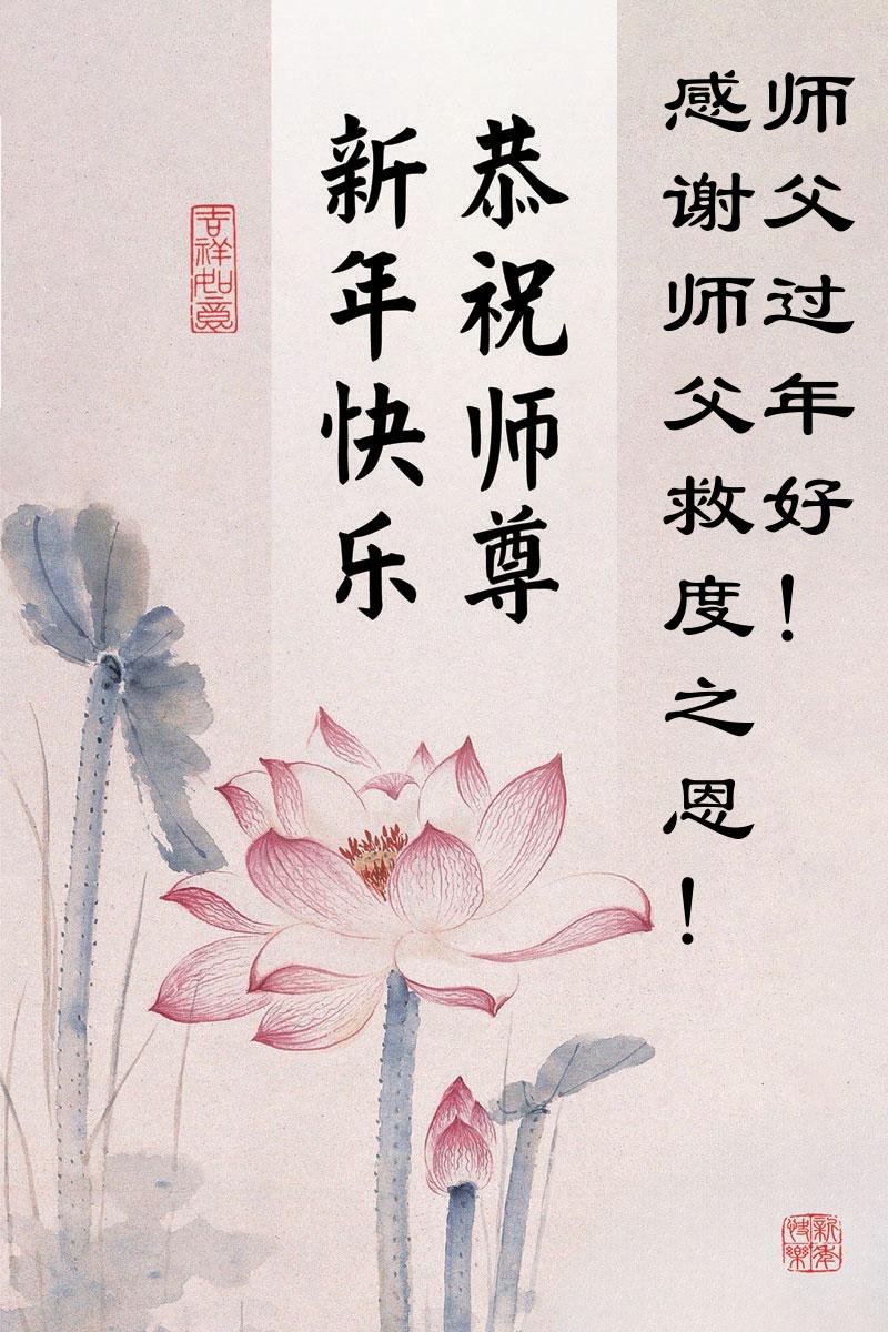 恭祝慈悲偉大的師父新年好!轉瞬又一年,弟子在師父的保護下又走過了一年。在師父用巨大承受延續來的時間裏,弟子一定勇猛精進,做好三件事,兌現來世誓約!