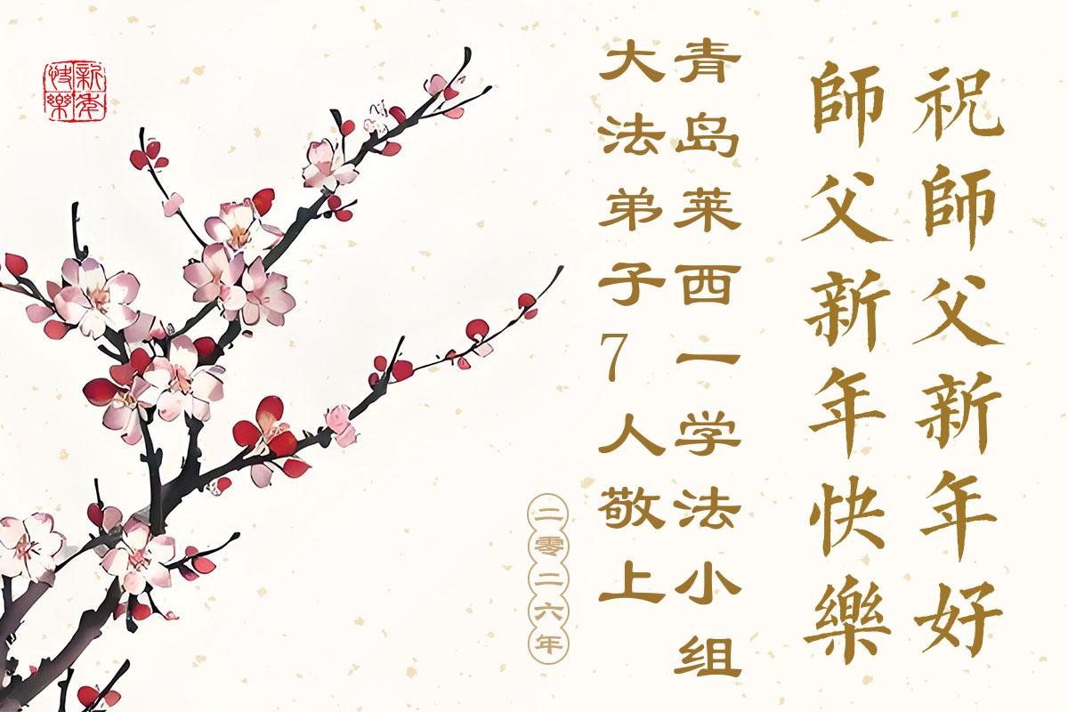 在新的一年即將到來之際,我們學法小組全體大法弟子遙祝師尊新年快樂!師尊您辛苦了!您為眾生付出太多、太多了!敬請師尊放心,弟子們一定努力做好三件事,走好助師正法的修煉路。讓師尊多一份欣慰,少一份操勞。謝謝師尊的慈悲苦度!