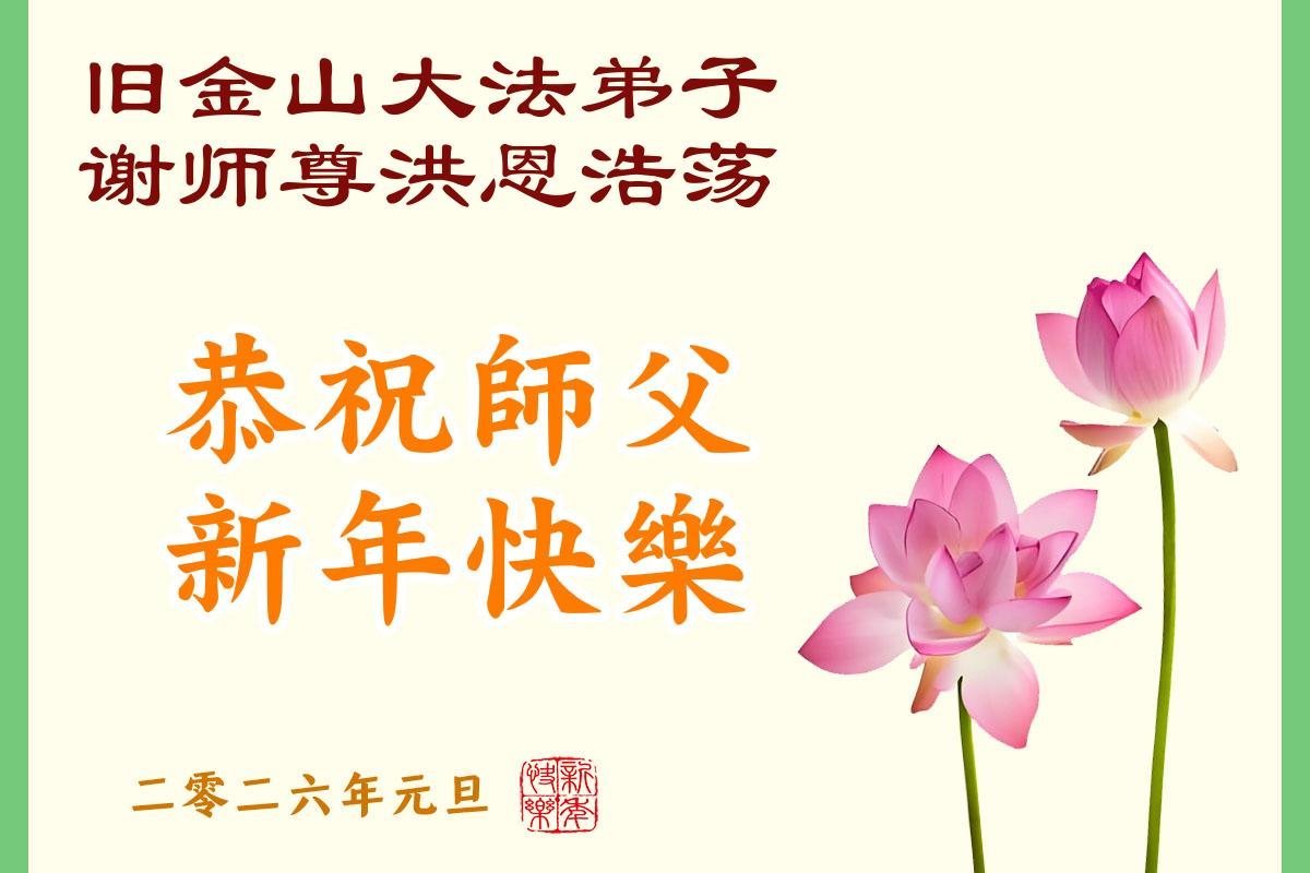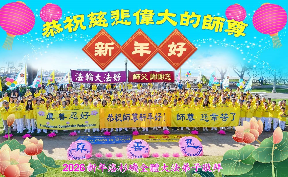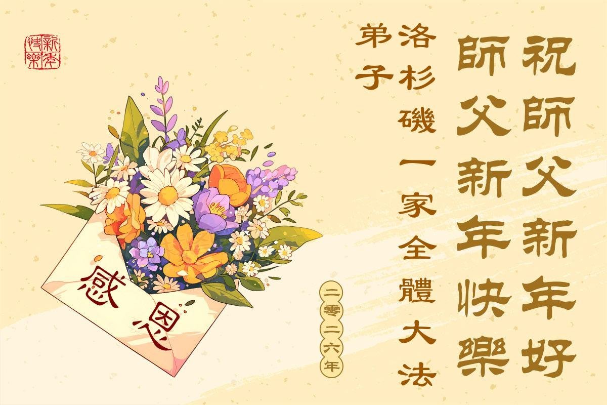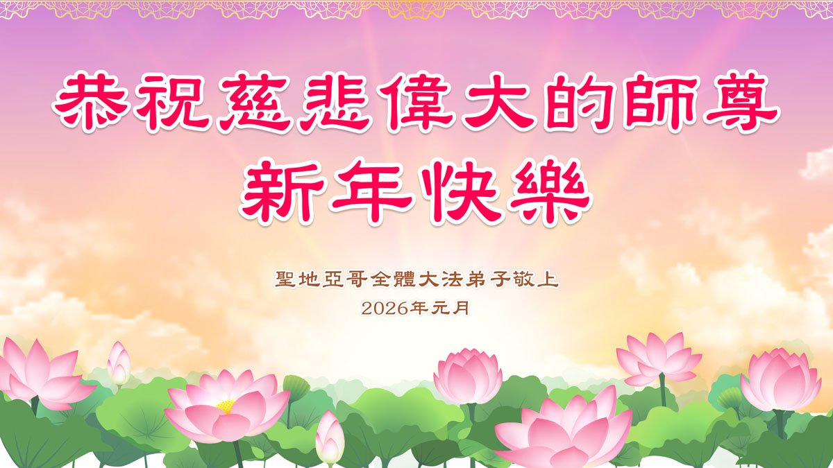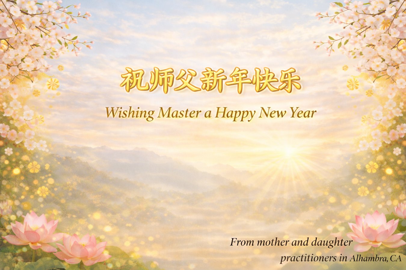 在2026年元旦即將來臨之際,我們蒙市煉功點及學法小組全體大法弟子懷著無限感恩的心情向慈悲偉大的師尊致以新年的問候!祝師尊新年好!弟子們窮盡人類的語言都無法表達師尊對弟子們的慈悲苦度!衷心的問候一聲:師父,您辛苦了!在新的一年裏我們要更加努力的做好三件事;在法難中更要以法為師,用法衡量一切,做到明慧不惑,堅定的維護師父、維護大法,助師正法,不辱使命!謝謝師父!