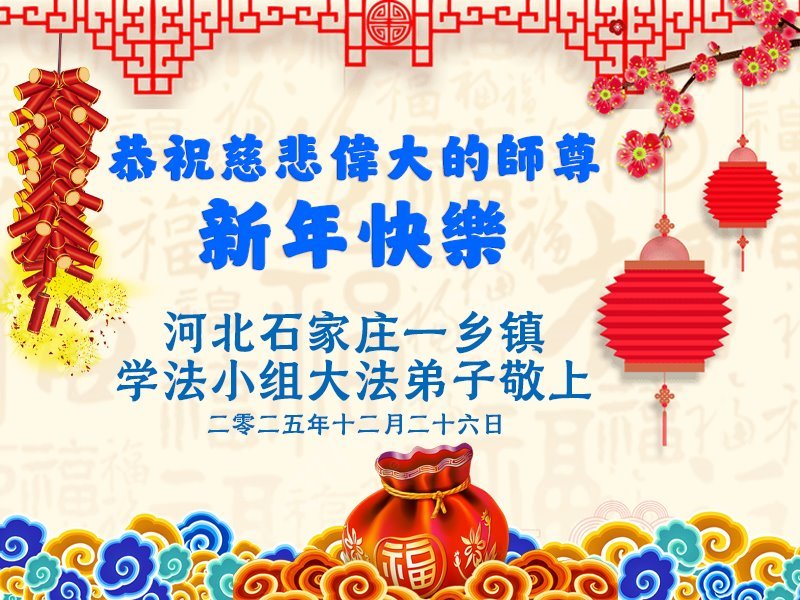 恭祝慈悲偉大的師尊新年快樂!在新的一年裏我們學法小組三人要互相促進、互相提高,努力做好三件事,修好自己,救度世人。