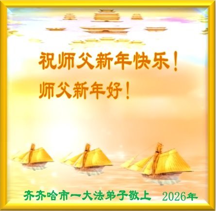 感謝師尊慈悲苦度!新的一年裏,弟子會牢記師尊的教誨,按照「真善忍」嚴格修心性,大法不離心,堅持每天學法煉功,珍惜這萬古的機緣,跟師父回家!