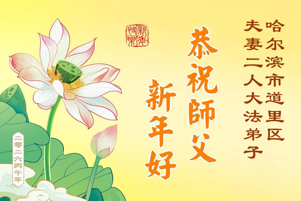 黑龍江省哈爾濱市道裏區夫妻二人大法弟子恭祝慈悲偉大的師尊新年快樂!