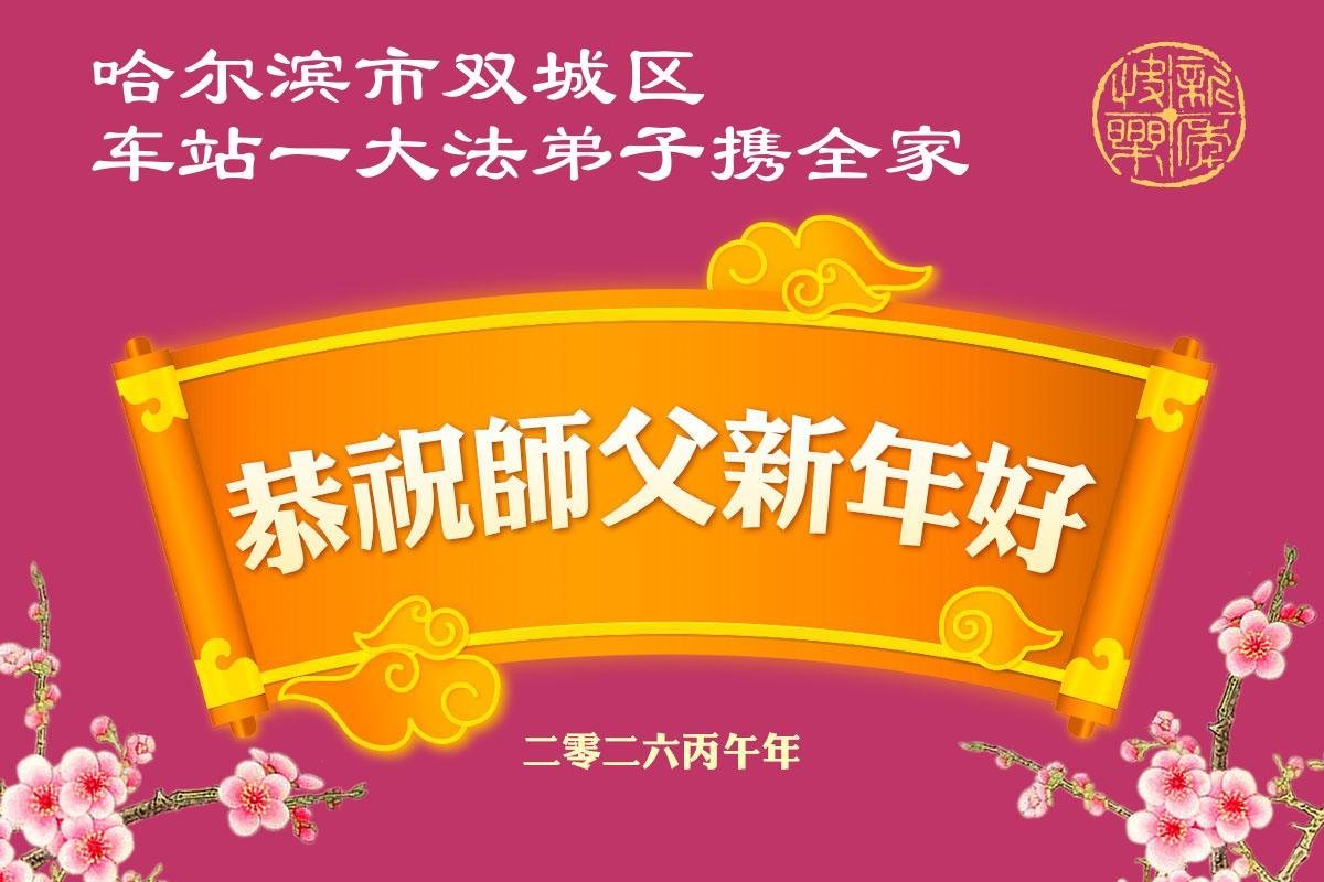 黑龍江省哈爾濱市雙城區車站一大法弟子攜全家恭祝慈悲偉大的師尊新年快樂!