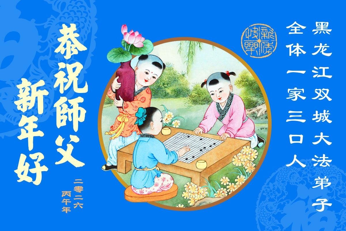 黑龍江省哈爾濱市道裏區一大法弟子攜全家恭祝慈悲偉大的師尊過年好!