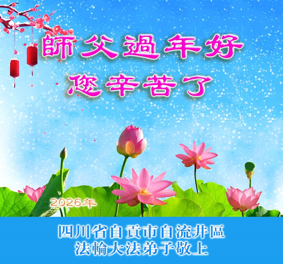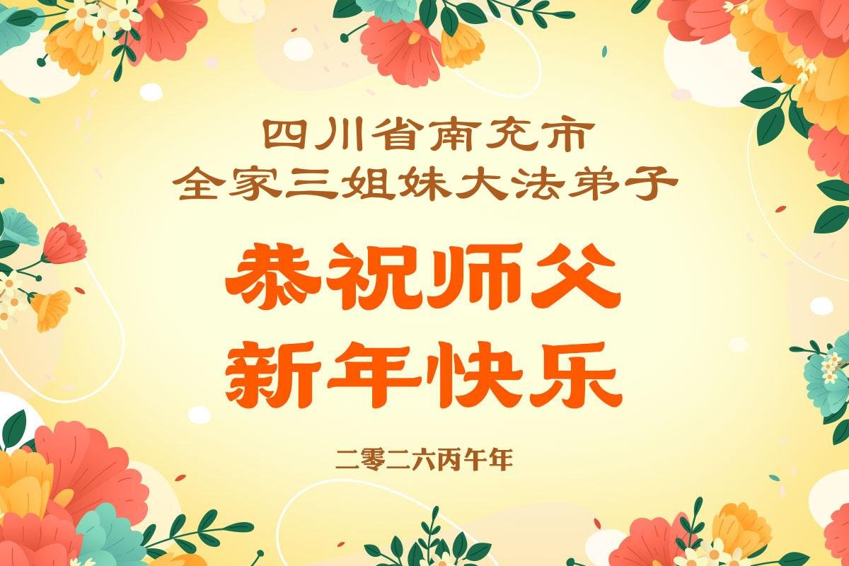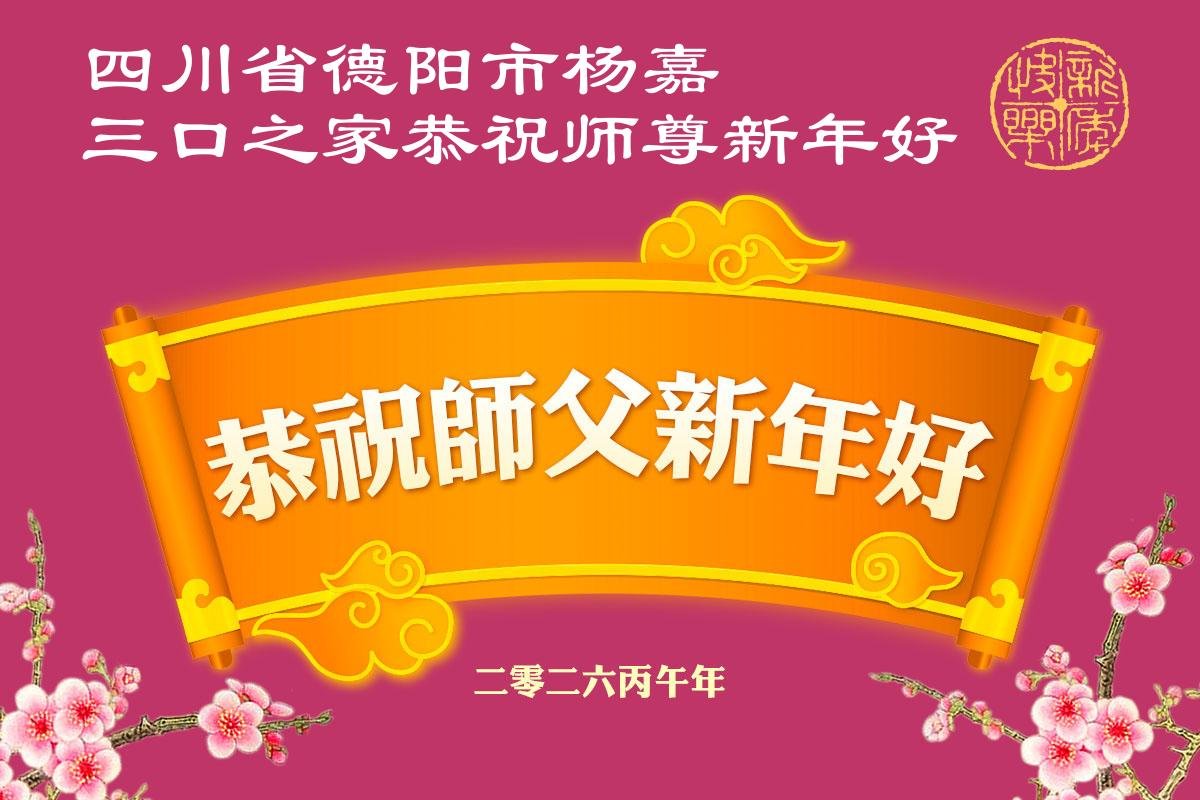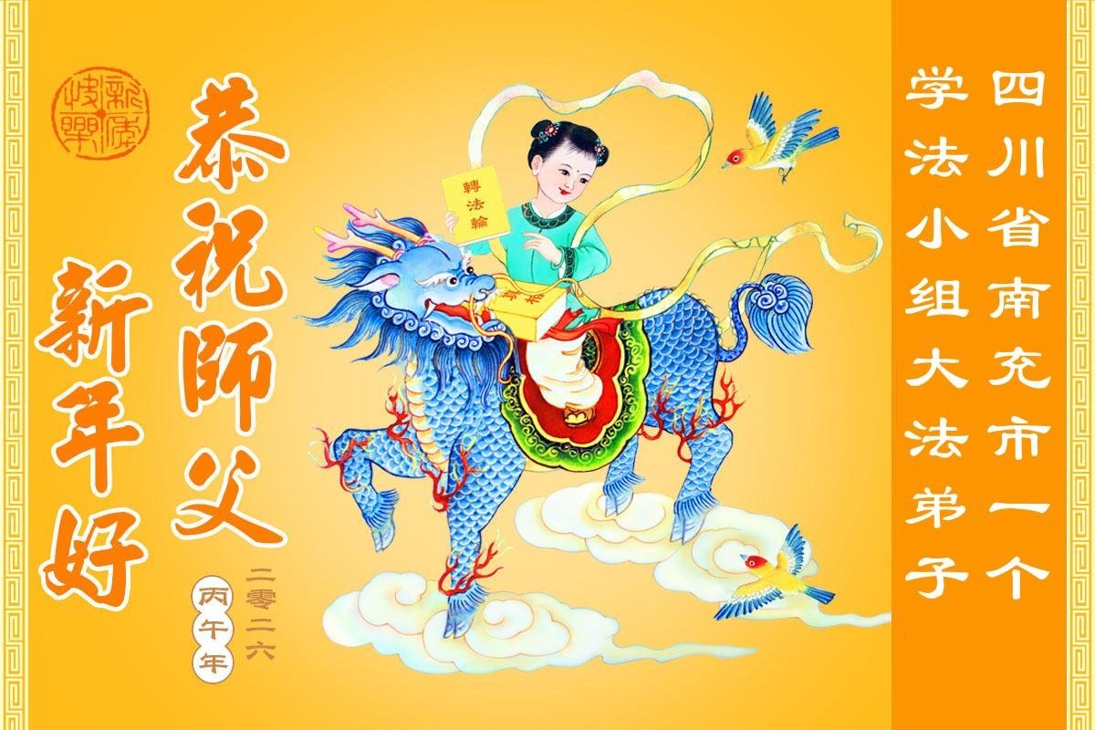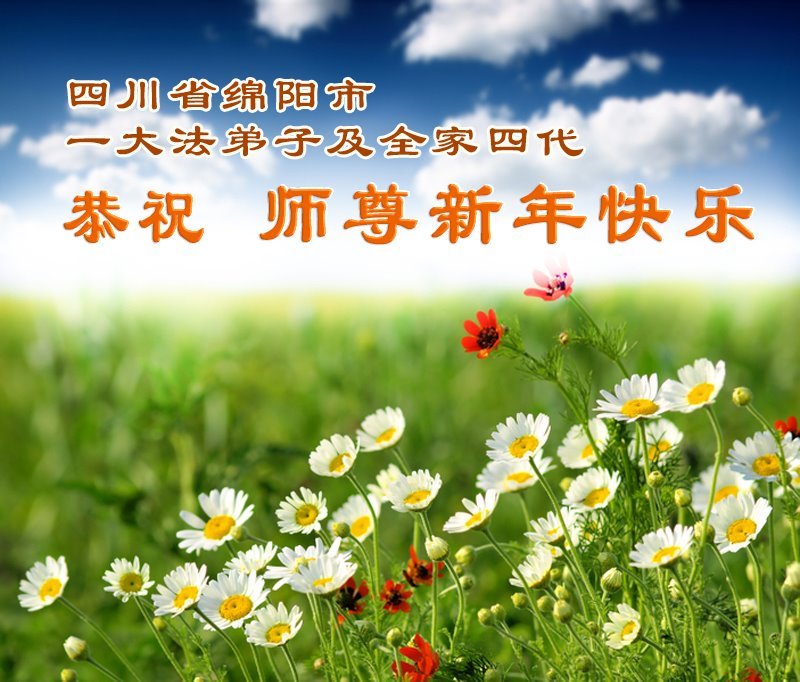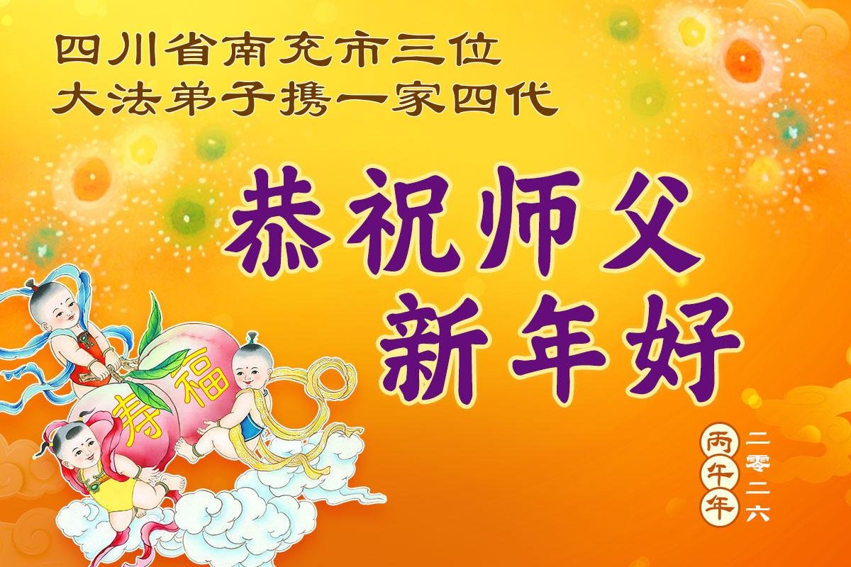 四川省資陽市大法弟子全家和親屬拜祝師父新年快樂!師父辛苦了!在師父的浩蕩洪恩救度下,我們全家幾經磨難,終於跨過了近二十六年的激流險灘,平安迎來丙午年。我們全家想念師父,盼望早日拜迎師父回國,與師父團圓。