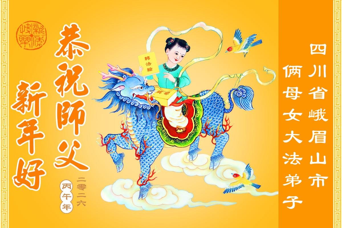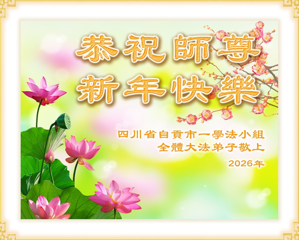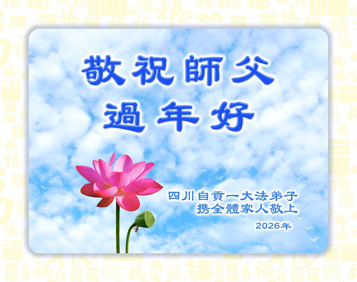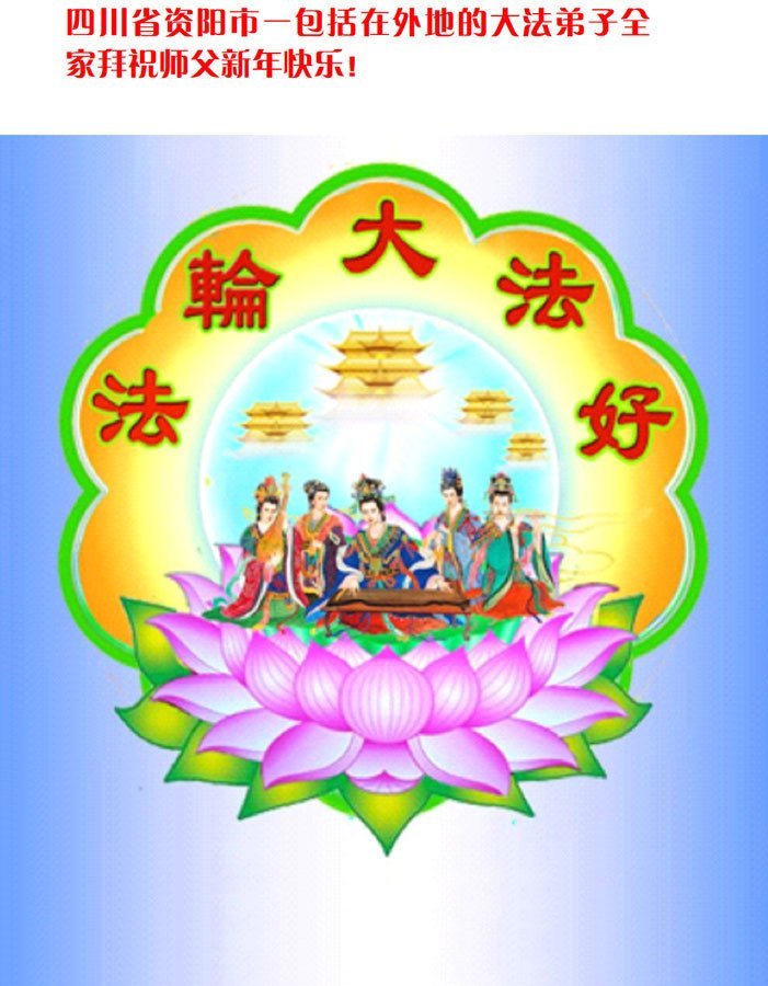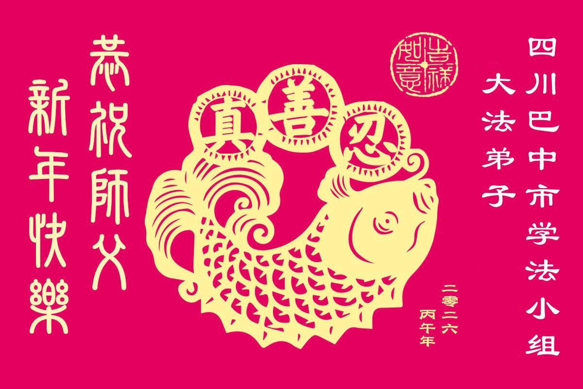 四川省資陽市大法弟子全家和親屬拜祝師父新年快樂!師父辛苦了!在師父的浩蕩洪恩救度下,我們全家幾經磨難,終於跨過了近二十六年的激流險灘,平安迎來丙午年。我們全家想念師父,盼望早日拜迎師父回國,與師父團圓。