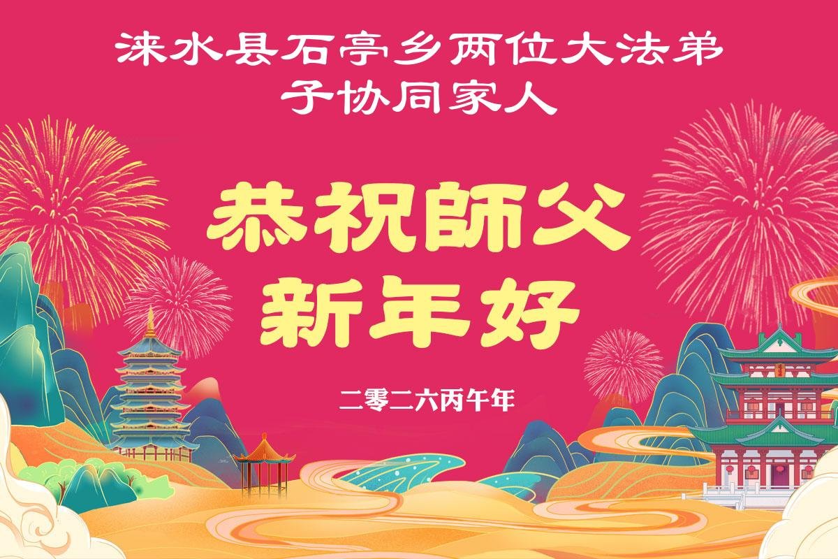 保定市淶水縣石亭鄉兩位大法弟子攜家人恭祝慈悲偉大的師尊新年好!