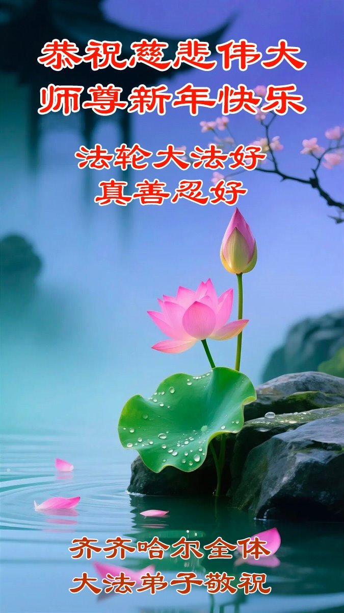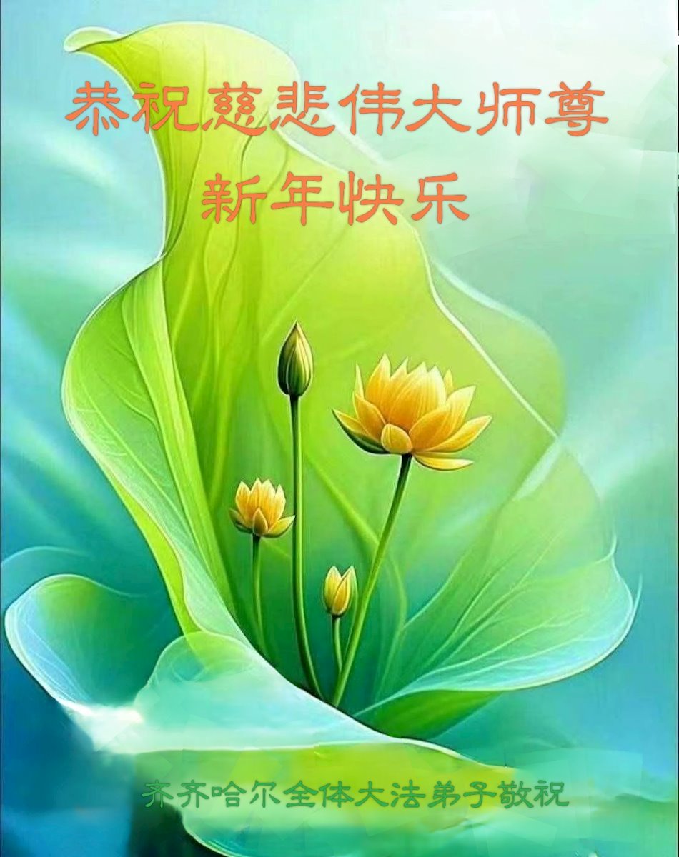 恭祝慈悲偉大師尊新年快樂!偉大的師父、偉大的法!弟子們會精進不怠、實修救人,遇事向內找,整體提高、昇華,讓世人沐浴在法輪大法的佛光普照!