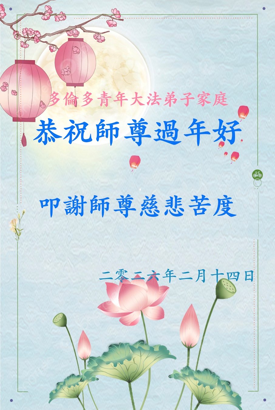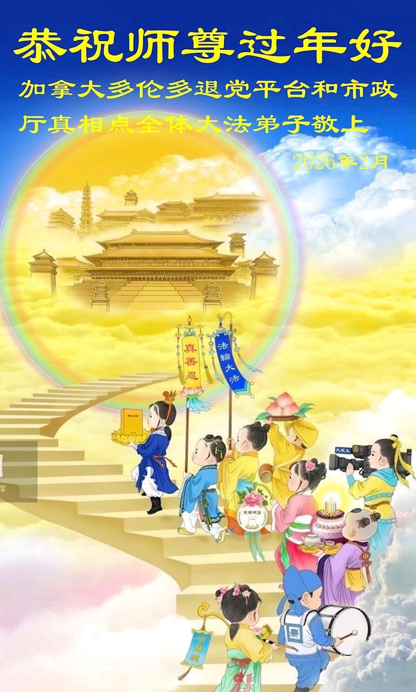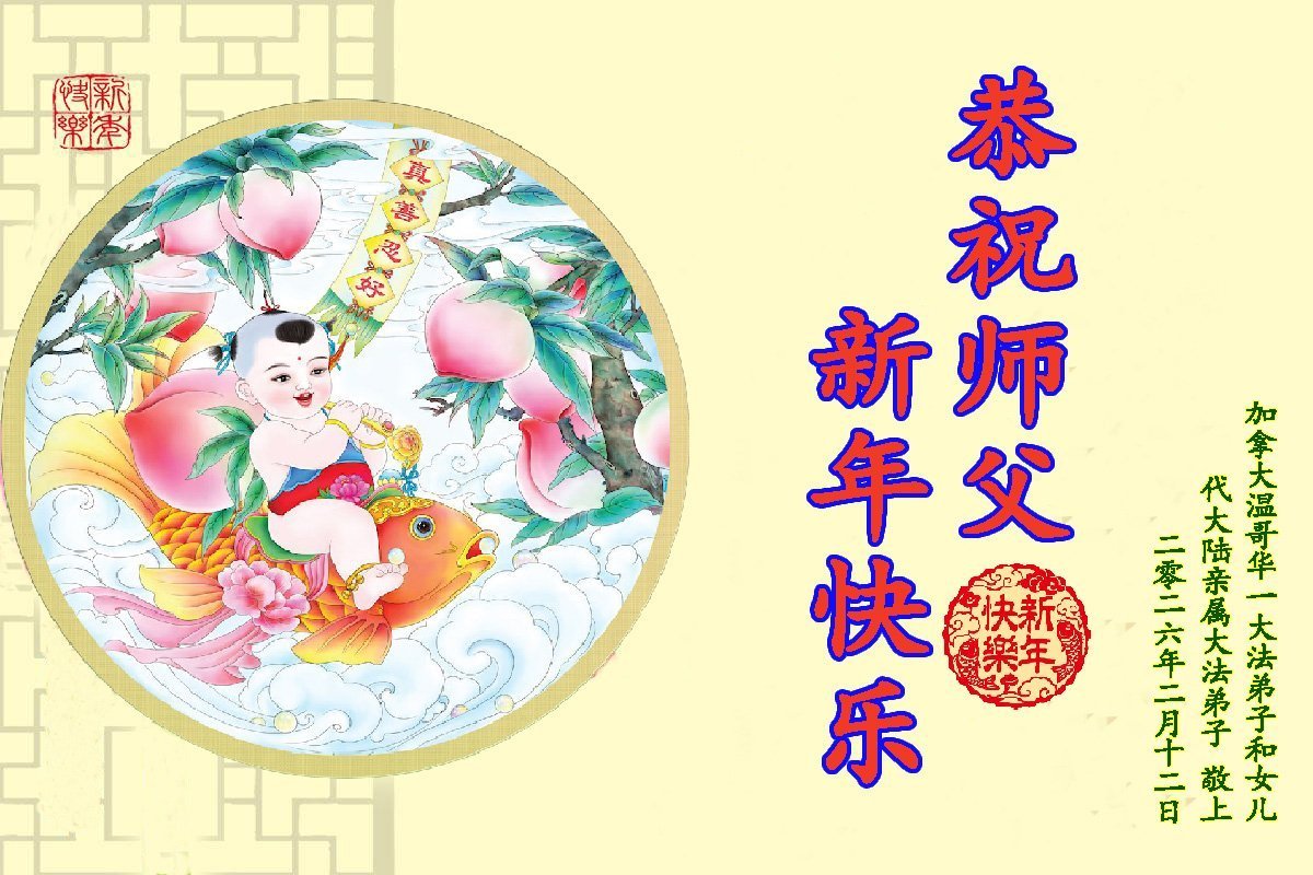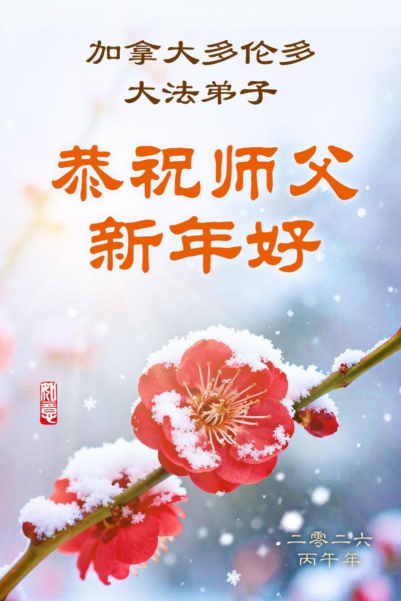 多倫多大法弟子(全家三代五口)恭祝慈悲偉大的師父過年好!給師父拜年啦!師父您辛苦了!弟子感恩師父慈悲苦度,走好正法路多救世人,修去人心人念人情,純純淨淨跟師父回家。弟子叩拜師父!