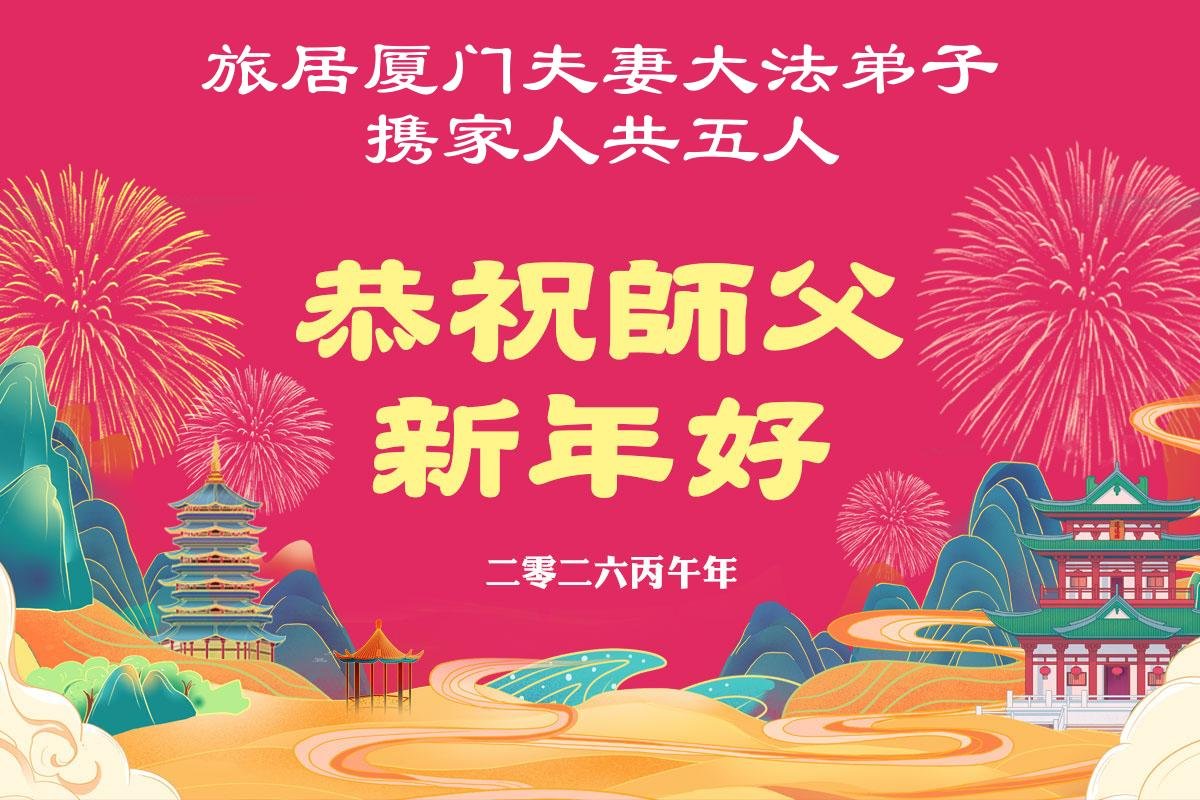 遙祝師尊新年快樂!無限感恩師尊的慈悲救度!在有限的時間裏,弟子一定做三件事。全家人經常念誦:法輪大法好、真善忍好!為他們自己選擇了美好的未來。弟子攜家人跪拜師尊!