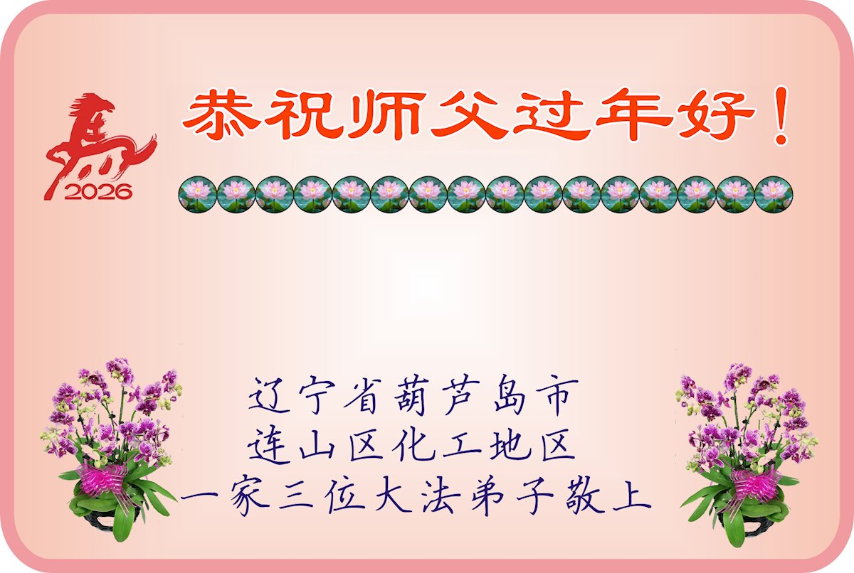 我們一家都是大法修煉人,多年來感恩師父慈悲苦度,我們全家人都在大法中受益。在此農曆新年到來之際,恭祝慈悲偉大的師尊過年好!