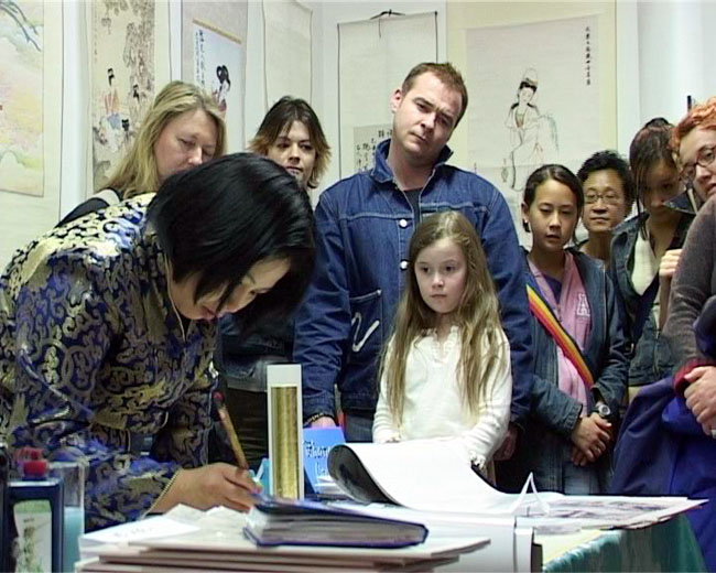 章女士為觀眾作了現場繪畫表演,並將當場完成的寫意花卉捐贈給人權組織。畫中所展現的中國傳統文化之美和中國繪畫的獨特意境令觀眾讚歎不已。