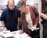 展銷會的組織者說,「我很喜歡法輪功的五套功法,讓人非常放鬆,我需要它。」她允許我們把法輪功的真相材料和請願書留在展廳的一張桌子上。她說,「你們可以隨時來這裏向人們介紹法輪功。」