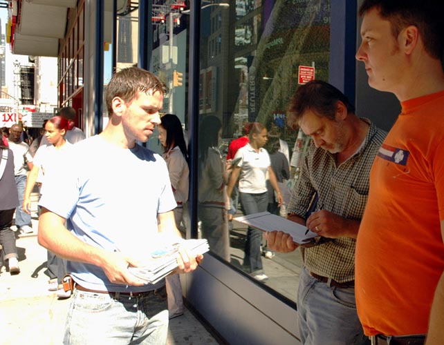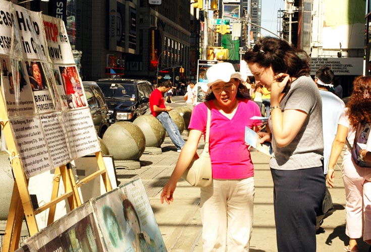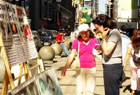 【明慧網2005年9月20日】剛結束了30個小時航行的多位新西蘭法輪功學員、坐了近20個小時飛機的台灣學員與美國學員一起,在中秋節這一天堅守在曼哈頓大街上向世人講法輪功真象。他們中有的人為了證實法多次跨越太平洋來到北美大陸,在曼哈頓度過了兩個中秋節。大家彼此之間似久別又相聚的家人,為同修們能在一起過團圓日而感到高興。大家以正念正行向尊敬的師父問候中秋!