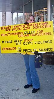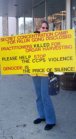 ![]() 金娜德手持展板在寒風中。展板寫著:秘密集中營曝光,法輪功學員遭摘取器官後被殺,請幫助制止中共的暴行,沉默的代價是大屠殺。 |