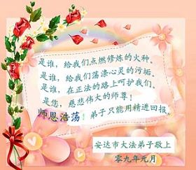 弟子們在師尊的呵護下走過了嚴酷的二零零八年,也使弟子們更成熟了,請師尊放心,弟子們一定謹遵師尊教誨,精進再精進,做好三件事,走好最後的路,完成史前大願,不辜負師尊的慈悲苦度和眾生的期盼,讓為弟子和眾生承受巨大苦難的師尊多一份安慰,少一份操勞,弟子們在此叩謝師恩,師恩浩蕩!