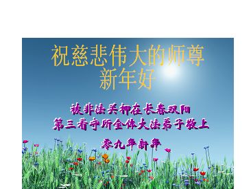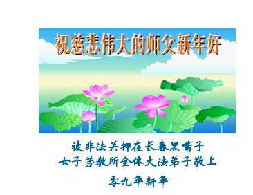 2009新年到來之際,被非法關押在黑龍江省女子監獄的全體大法弟子恭祝慈悲偉大的師尊節日快樂!我們堅信師父,堅信大法!雖身處險境,我們也能做好師父要求的三件事,正念正行,早日解體魔窟,匯入正法洪流,完成史前大願,圓滿隨師還!