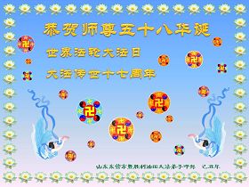 山東省煙台市芝罘區一學法小組全體大法弟子敬祝慈悲偉大的師父生日快樂!紀念師尊洪傳大法十七週年!慶賀「世界法輪大法日」的到來!