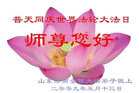 山東青州全體大法弟子恭祝師尊生日快樂!熱烈慶祝法輪大法洪傳十七週年!同祝第十屆世界法輪大法日!