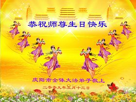 大法洪傳十七載,再造寰宇,萬象更新。值此恩師壽辰暨世界法輪大法日之際,青島即墨市大法弟子恭賀師尊生日快樂!普天同慶同賀「五一三」世界法輪大法日。