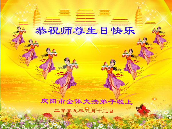 弟子流著無限感恩的淚水恭祝慈悲偉大的師尊生日快樂!師尊辛苦了。師恩浩蕩,弟子無以回報。只有勇猛精進,更加努力做好師尊交待的三件事,「正念正行,精進不停」。救度更多的人,不辜負師尊的慈悲救度,圓滿隨師還。弟子雙手合十跪拜師尊。並代表我們這個資料點的全體大法弟子向慈悲偉大的師尊問好!代表五月十三日就走出黑嘴子勞教所的姐姐向慈悲偉大的師尊問好!
