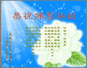 衷心感謝師父這些年來所給予我的一切。前幾年,我沒有按照師父的要求做到精進實修。在未來的日子裏,我會抓緊時間,努力做好三件事,彌補以前的損失。祝師父生日快樂!不久的將來,大法會在人間展現美好光明!