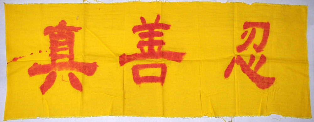 我看著堆在地上的大法橫幅,心疼不已。這條「真善忍」小橫幅和那條「法輪大法」大橫幅,是我們離家的前幾天,丈夫一筆一畫傾注心力寫成的,他一邊為我們母子出行作準備,一邊說:「等學生考卷批完上交後,我就出發進京護法。」我看著橫幅上神聖無比的「法輪大法」、「真善忍」這幾個大字,告訴他:「我要把橫幅帶回來!」