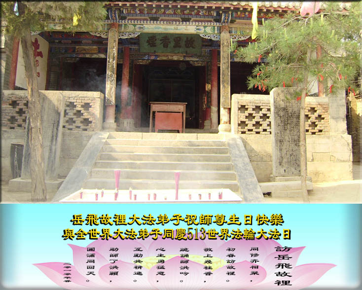 今年初春,幾位大法弟子有機緣聚在一起,訪岳飛故里,同修們替那些在中國大陸被迫害致死的同修、被非法關押的大法弟子向師尊敬香,共同感受到師尊的無以言表的慈悲與苦度。大家向師尊發願並跪在地上齊背了《遊岳飛廟》、《訪故里》、《師徒恩》等幾首《洪吟》,然後向師尊合十。香呈現蓮花狀一層層綻放,每一炷香都是如此,我們拍下了照片,在準備將這張照片作為賀卡時,才發現照片中有很多法輪呈現,師尊對弟子們的鼓勵使我們更加知道三件事的重要,更明白自己做好三件事的意義,請師尊放心,弟子會做好三件事,隨師把家還。