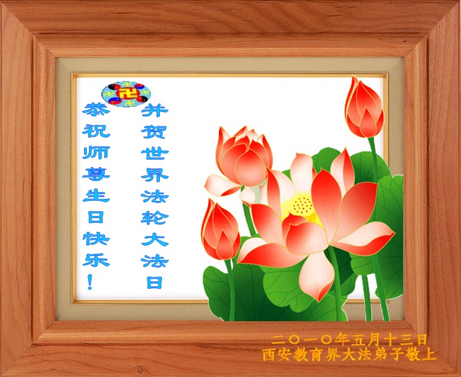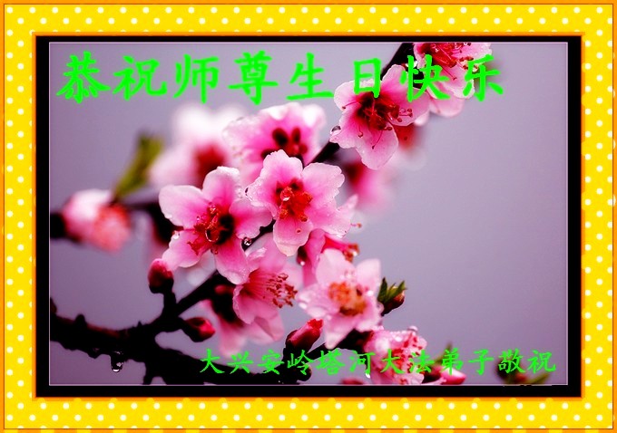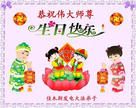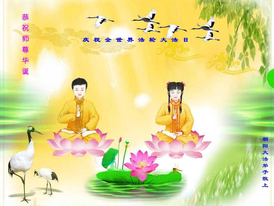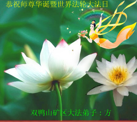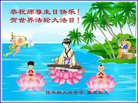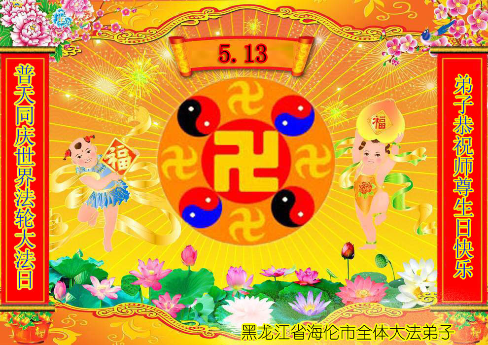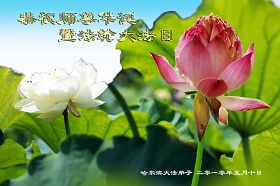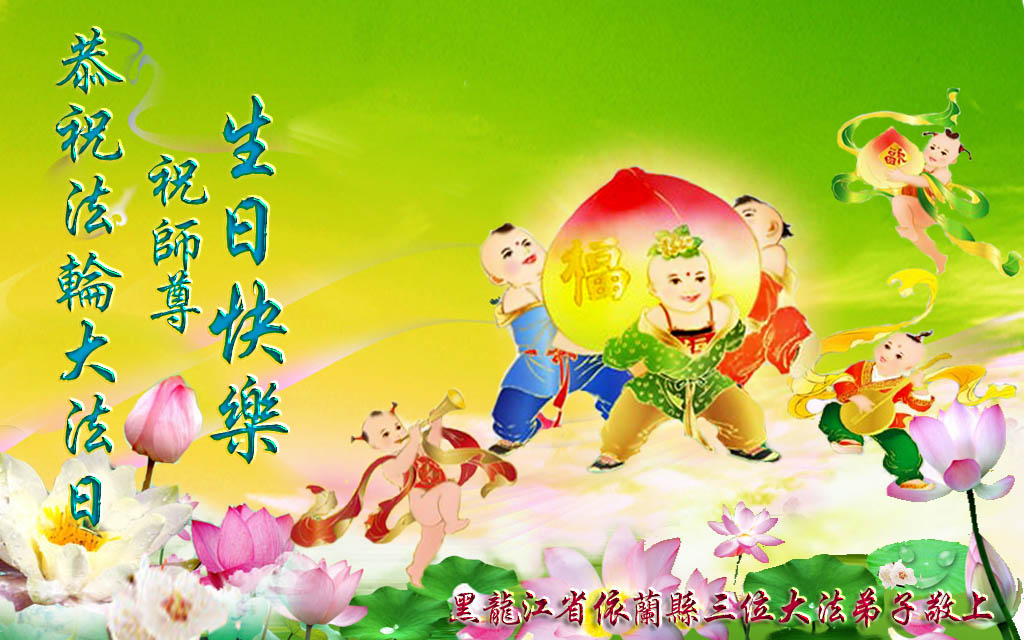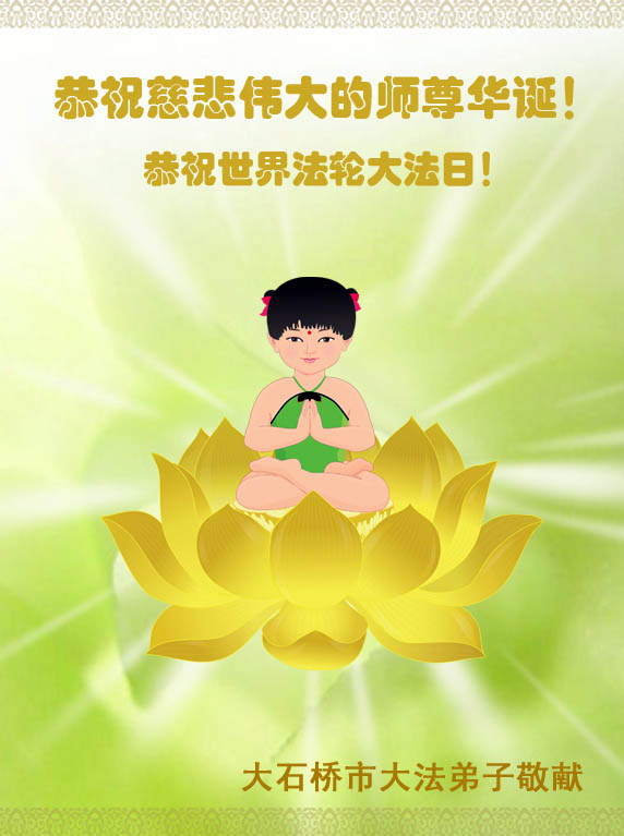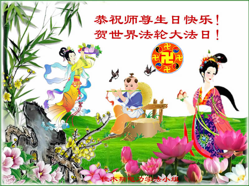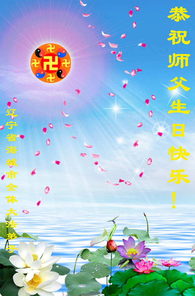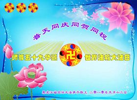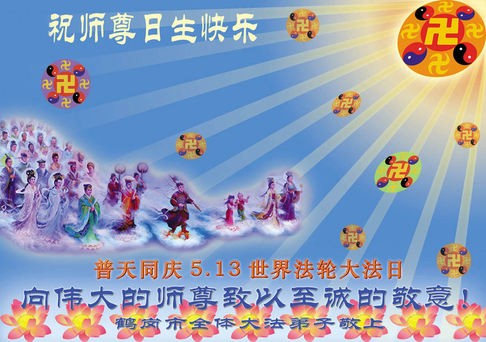 慈悲偉大的師尊您好!在這普天同慶師尊華誕、法輪大法日到來之際,我們向慈悲偉大的師尊問好:恭祝師尊生日快樂!我們幸遇大法,是師尊洪大的慈悲,惟有做好師尊要求的三件事,才不負師尊的慈悲苦度。現在正法已經到了最後階段,我們要學好法、發正念、講清真相,救度眾生,越最後越精進,形成一個整體,兌現史前誓約,完成史前大願。