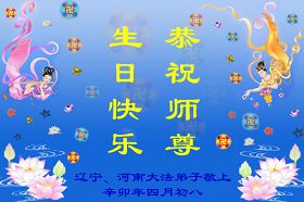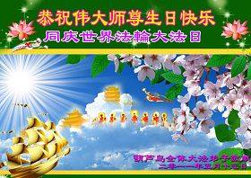 值此師父誕辰之日,中國江蘇南京大法弟子向慈悲偉大的師父致以最誠摯的慶賀,恭祝師父生日快樂!我們將做好三件事,多承擔一份責任,讓師父多一份欣慰、少操一份心。