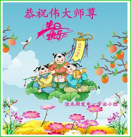 在第十二屆世界法輪大法日暨師尊六十華誕來臨之際,大陸一學法小組遙祝師尊生日快樂,弟子們一定會互相督促多學法、修好自己,做好三件事,在最後的最後,多救人,完成史前誓約。不讓師尊操心,給師尊多一些安慰。