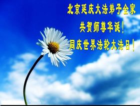 在師尊六十歲華誕及世界法輪大法日即將到來之際,我們北京老弟子向偉大慈悲的師尊感恩,並從生命的深處恭祝師尊華誕快樂,師尊您辛苦了!弟子只想一心做好您要求的三件事,多救人,走正正法路,兌現我們的史前誓約,跟您回家!