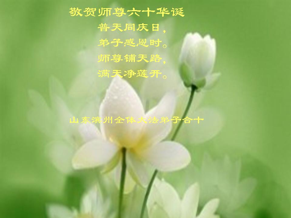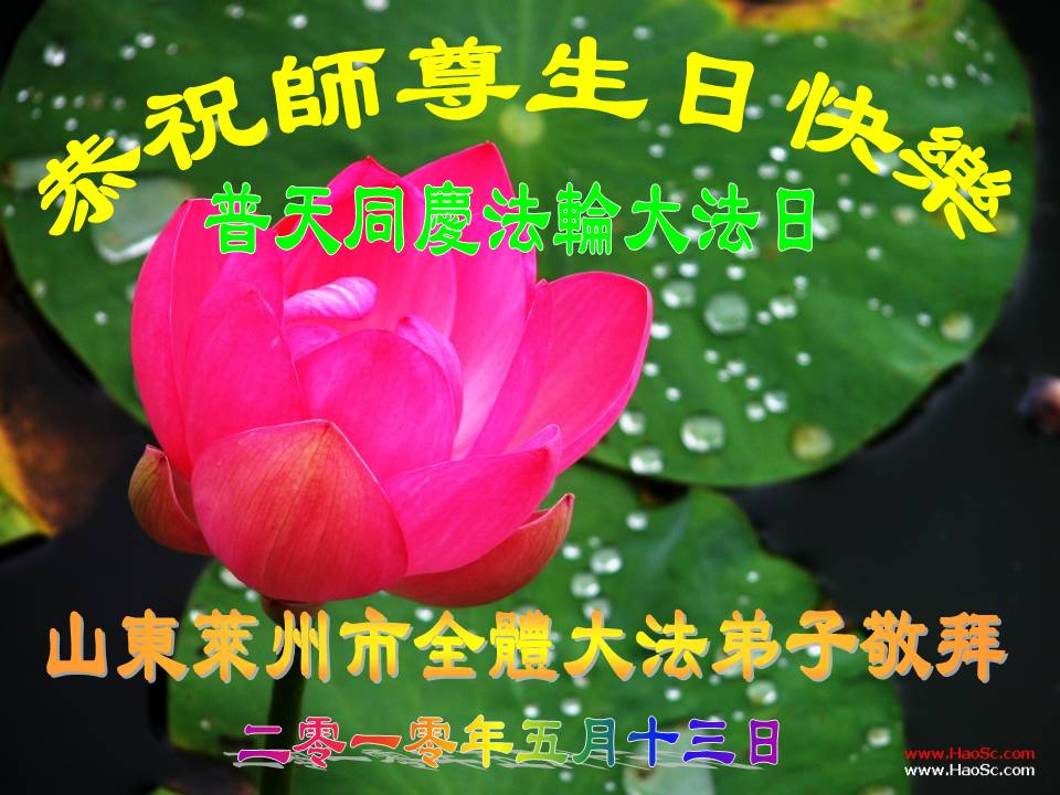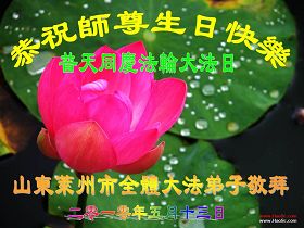 山東萊州市全體大法弟子敬拜慈悲偉大的師尊生日快樂!在這正法最後的時間裏,一定勇猛精進,做好三件事,救度更多的眾生,隨師返家園!