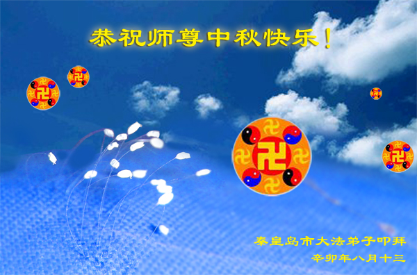 慈悲偉大的師尊您好!每逢佳節倍思親,大法弟子想念師尊。在這中秋佳節之際,秦皇島市大法弟子叩拜師尊,恭祝師尊中秋快樂!師尊辛苦了。請師尊放心,大法弟子絕不辜負師尊的慈悲救度,在正法最後的最後時期,弟子們一定謹遵師尊的教誨:學好法,向內找,修好自己,整體配合做好三件事,兌現助師正法救度眾生的史前大願,隨師回歸大圓滿。