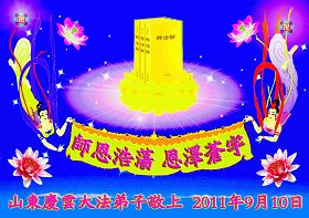 尊敬的師尊:您好!我們是山東招遠市一學法小組的大法弟子,今借我們中國人的傳統節日──中秋節,向恩師表示最親切的問候!祝願師尊節日快樂!我們小組的大法弟子都是九九年以前的大法弟子,回憶起九九年以前的幸福時光,真是一番感慨,有師父在我們身邊真是無比的幸福。九九年七二零,中共邪黨全面打壓法輪功,我們都生活在恐怖的邪惡環境中,但我們並不感到孤獨,因為我們知道,師尊您時時刻刻在我們身邊呵護著我們、點悟著我們。十幾年過去了,我們在磨難中鍛煉成熟了,我們想念師尊,請師尊放心,我們會繼續走好今後修煉的路,抓緊時間多救人,兌現來世的誓約。圓滿隨師還。合十