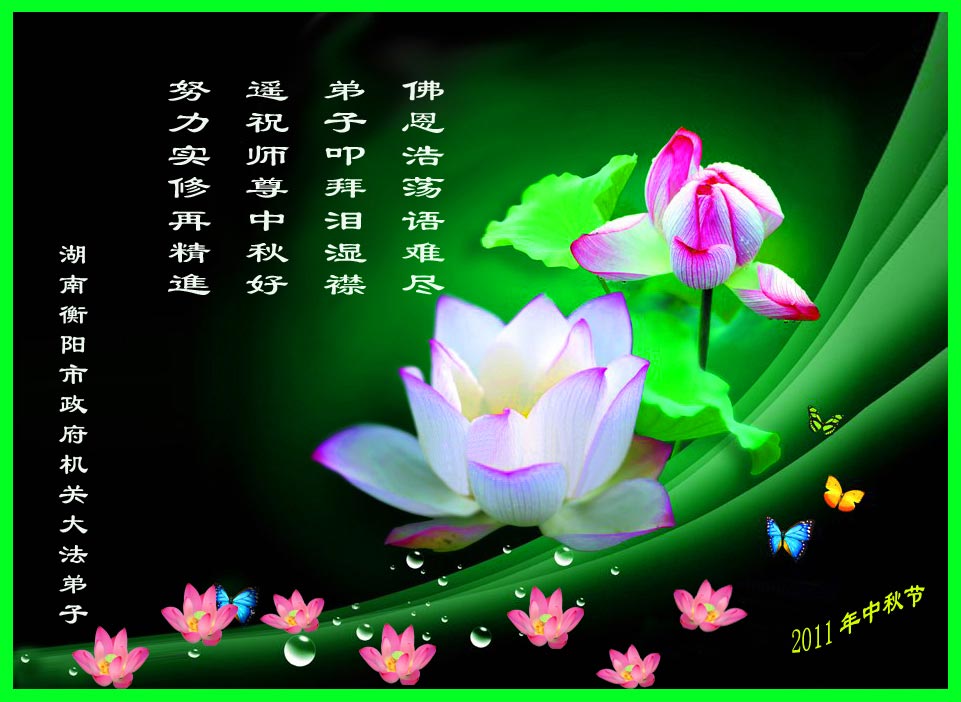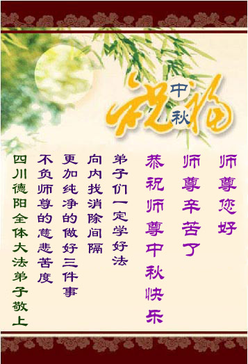 我們是深圳大法弟子,十多年來我們以法為師,忍苦精進,走到今天,深感師恩浩蕩!在佳節來臨之際,我們衷心祝願偉大的師尊中秋節快樂,請師尊放心,我們一定做好三件事,無論多苦,我們都會跟隨師尊走向圓滿。