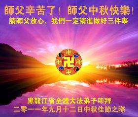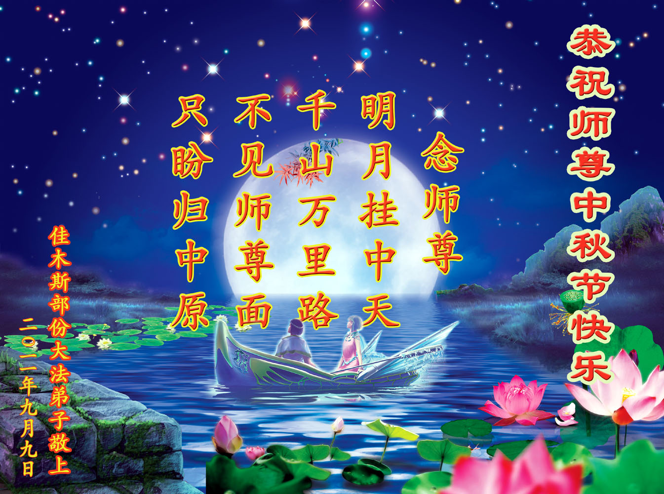 師尊辛苦了!弟子們想念您!中秋佳節之際也是億萬大法弟子期盼能與師尊團聚的時刻,借明慧一角,略表一點點弟子們對師尊的無比感激之情!弟子們的成長,時刻離不開師尊的慈悲呵護,師尊為弟子與眾生的承受和付出,是生命永遠都無法報答的;在今後的正法關鍵時日裏,弟子們只有更加不斷精進實修,圓容師尊所要的,努力承擔起歷史賦予我們的責任與使命,紮實做好大法弟子該做的事,儘量讓師尊多一份欣慰,少一些操勞。弟子們在此叩拜師尊!