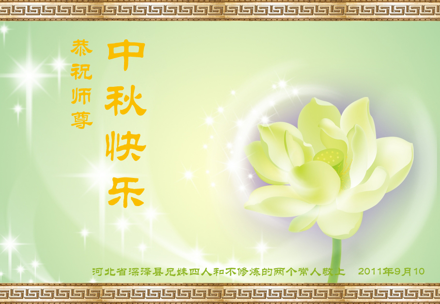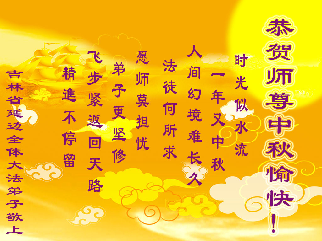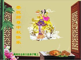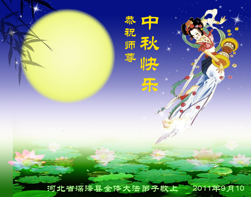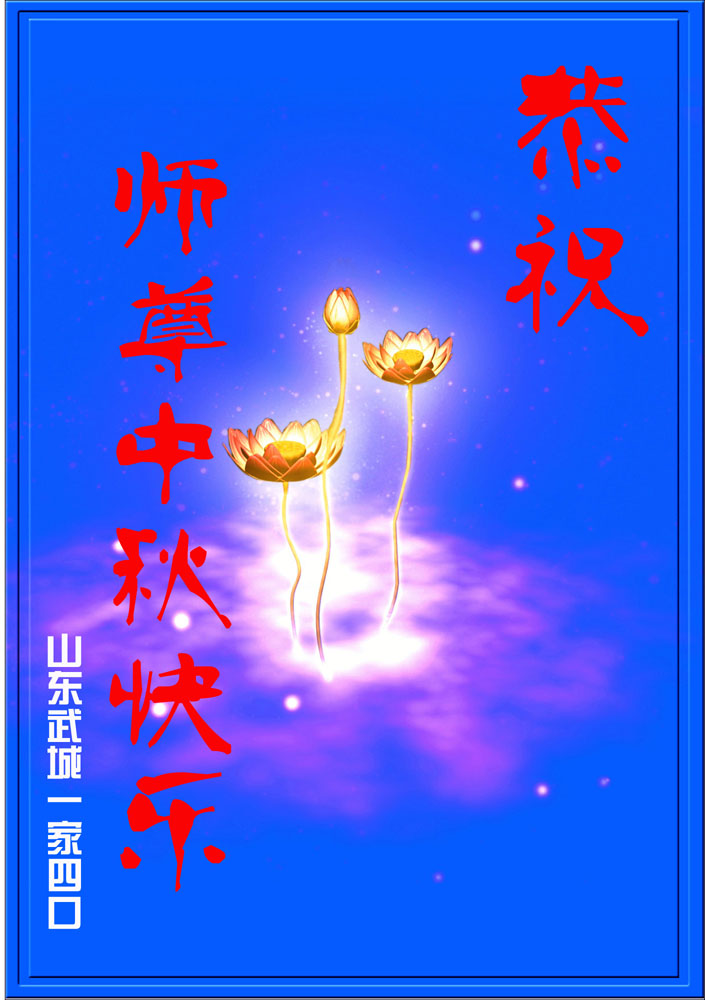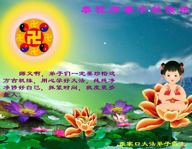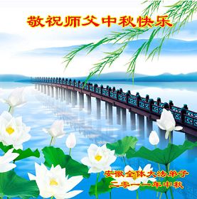 我們全家恭祝師尊中秋快樂!並代表漣水縣全體大法弟子感謝師尊的慈悲苦度,我們一定會堅定實修,圓滿隨師還!